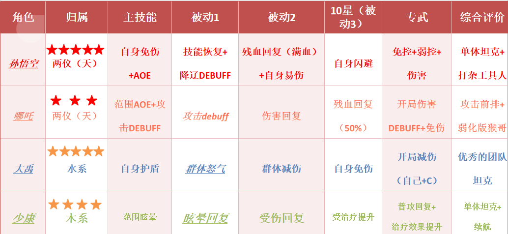 单体坦度:孙悟空(5星可用)>大禹>少康>卫青>哪吒>其他;(同星对比)