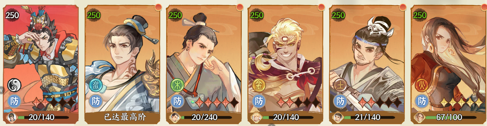 两仪:孙悟空 水系:大禹 木系:少康 金系:程咬金 土系:卫青 火系:妇好