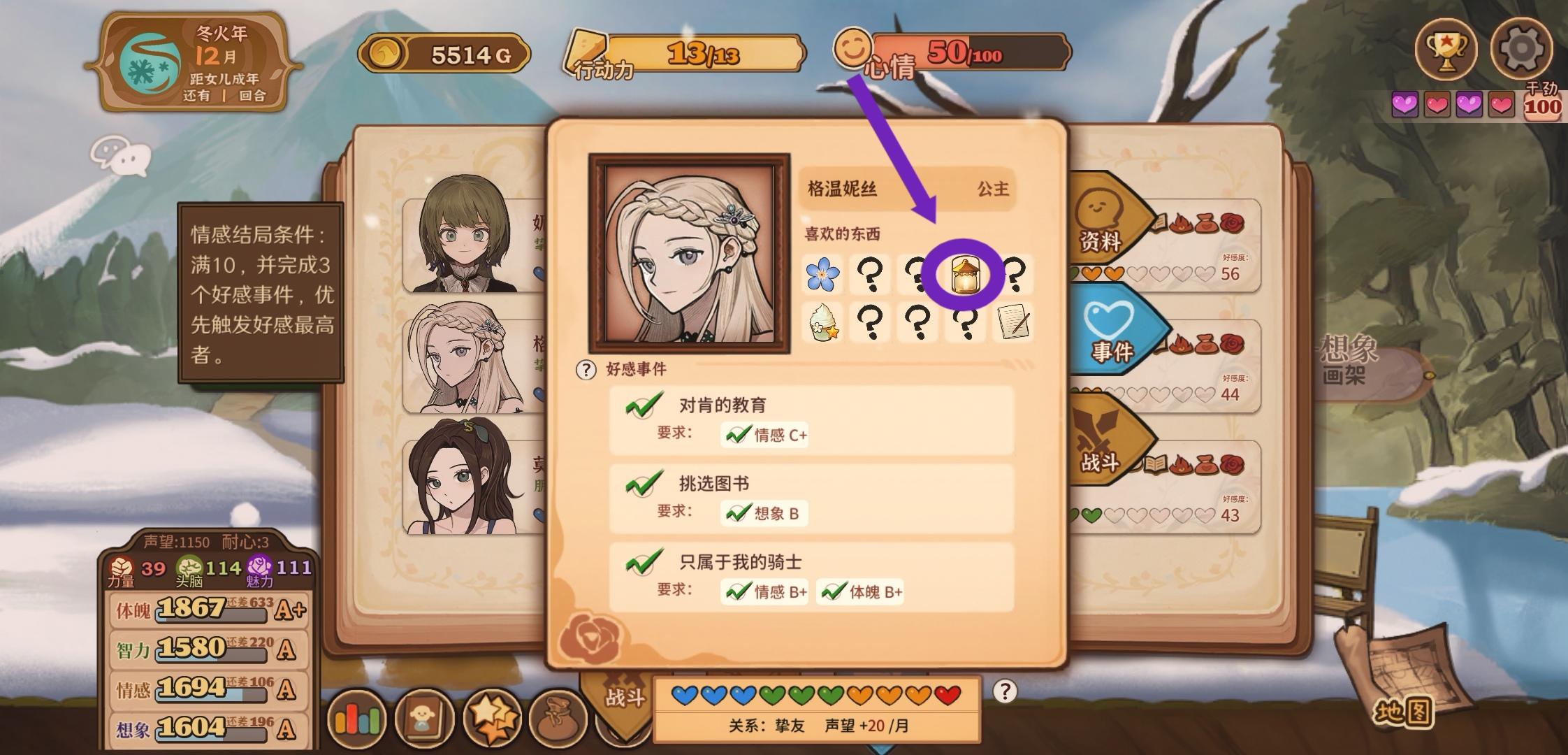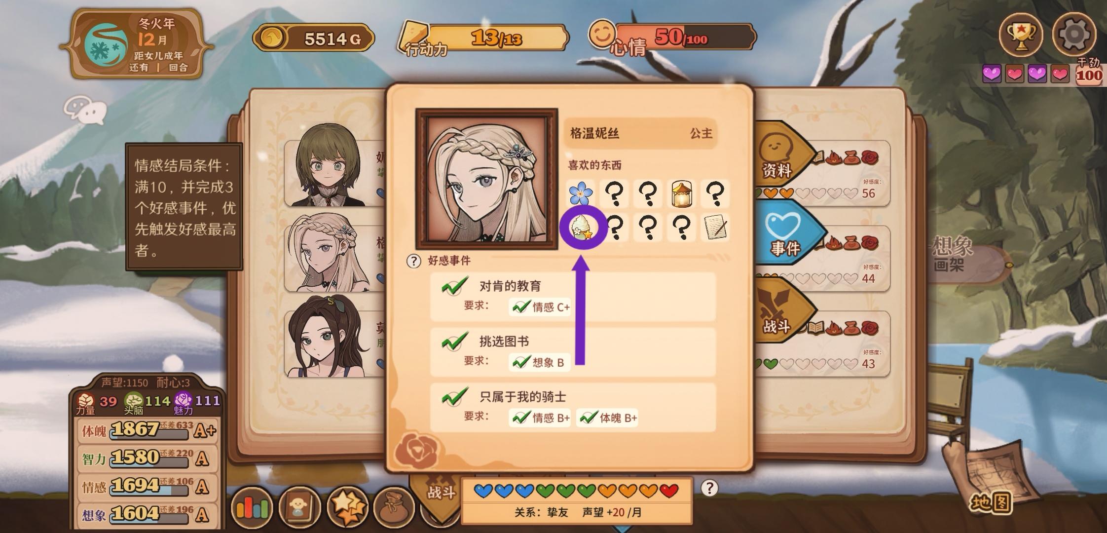 体力:本森喜欢的金星烧烤龙虾肉(行动+4)没有的话,船夫喜欢香肠,依旧是在包里面吃,然后跟上述刷属性一样的操作#火山的女儿再度重逢