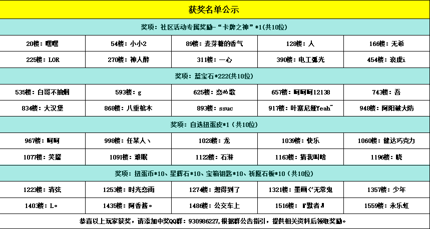 恭喜以下幸运的小骑士获得活动奖励,请中奖的小骑士添加获奖群:930986227,请加获奖群后,登记相关获奖信息,超过15个自然日未进群未登记视为放弃奖励~