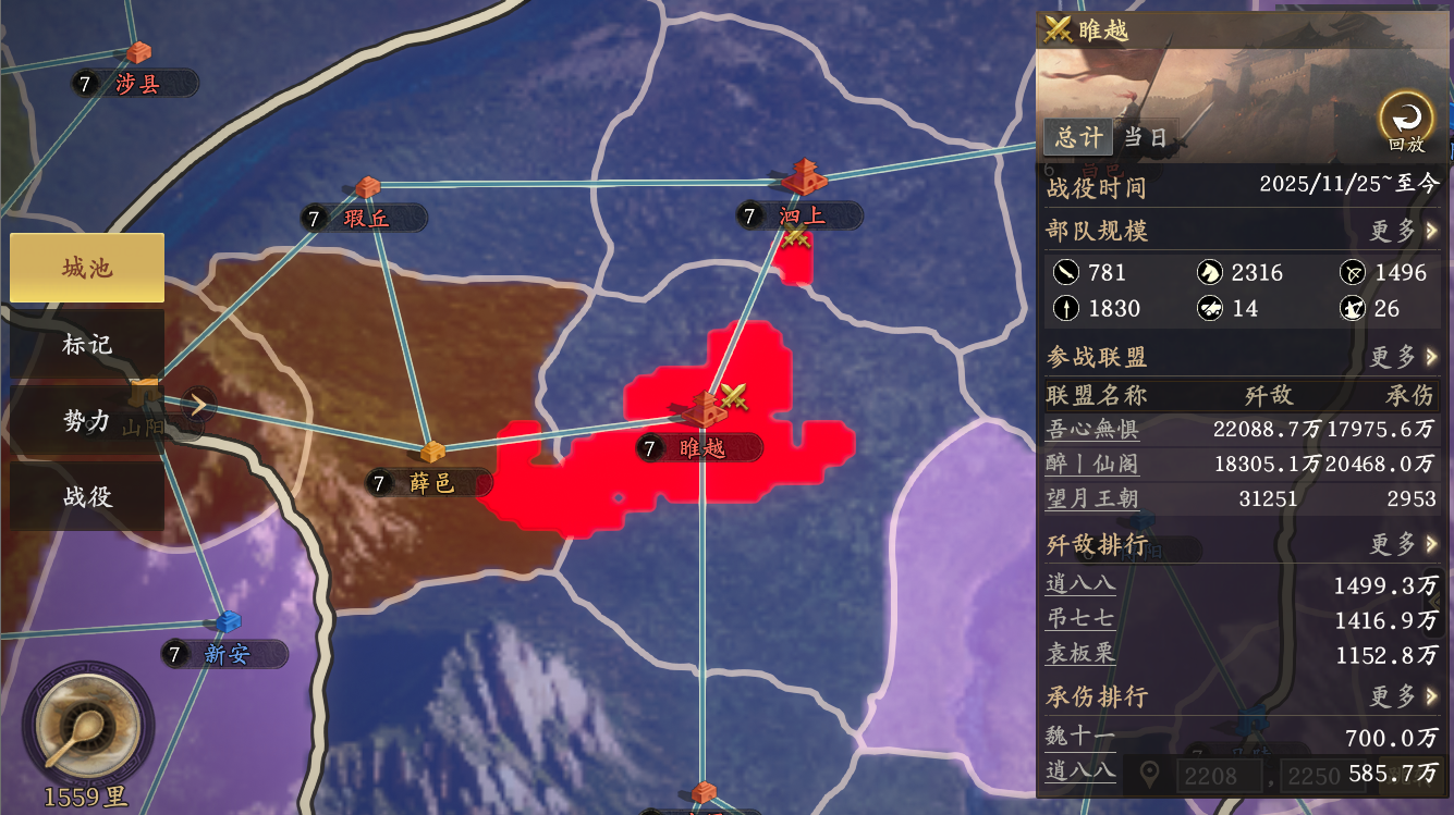 11月26日上午,望月拿下渡口后,哈基严阵以待,望月尝试在哈基7级城口拍营垒,均被哈基攻破