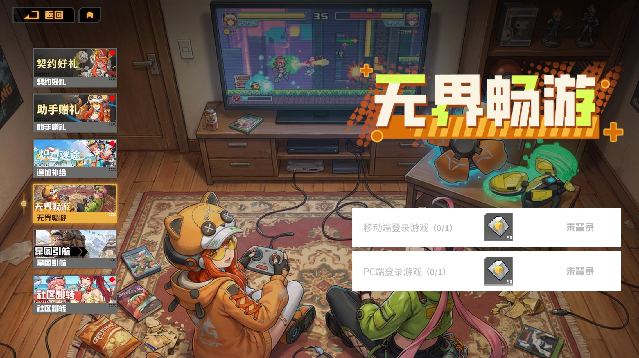 新增无界畅游活动界面!在多个平台(PC/移动端)登录游戏即可获得奖励,奖励领取完毕活动界面将消失。