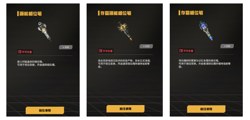 - 存蓄相位笔:可用于相位变换,开启普通相位槽并维持当前等级