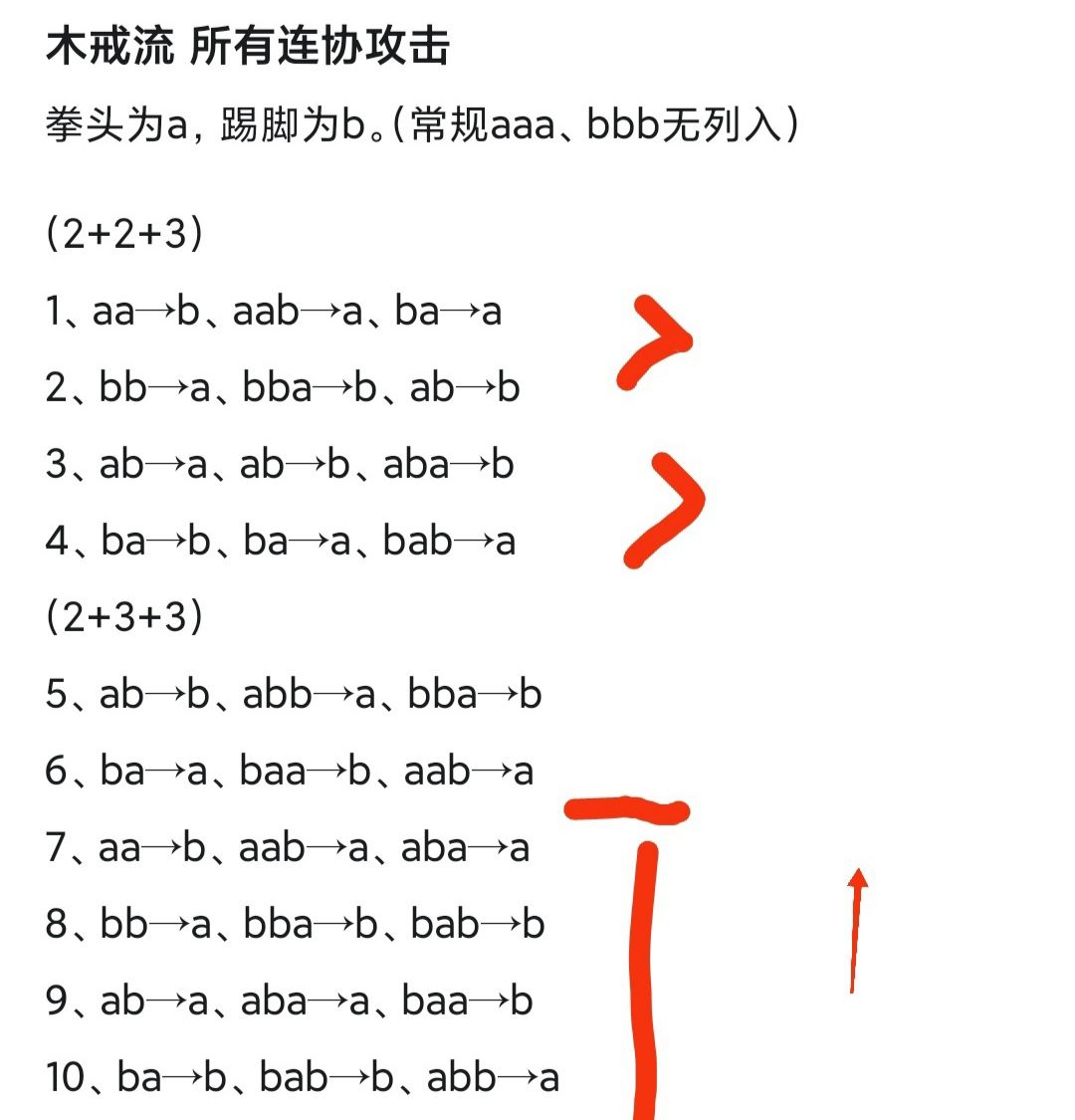 前置说明:a、b区分拳、脚,只写a部分,b部分拳脚互换即可。如图里偶数组本质上是前奇数组的互换,所以没列偶数组部分。三个短条的组合也省略。省略→号,知道最后一位是终结技即可。命名3个招式位置分别为头、身、尾。