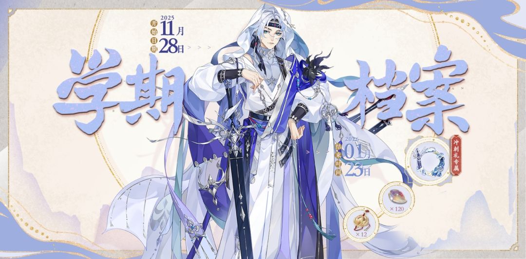明雍书院新学期即将开启,云无羁新装【云山暮雪】将加入精英奖励套餐,考评等级达到10级即可领取。解锁新装即可为名士更换立绘表现,并解锁头像【云山暮雪】以及新装专属互动语音。