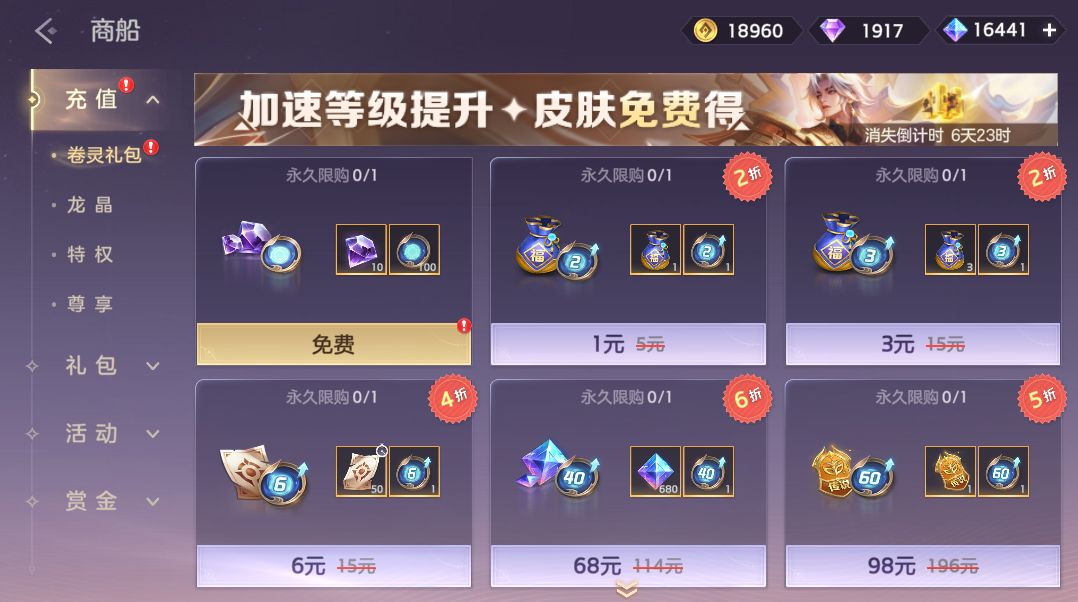 卷灵礼包限时直售,绘卷传说皮肤自选箱、龙晶、绘卷经验包、绘卷福袋、残卷等你来拿。
