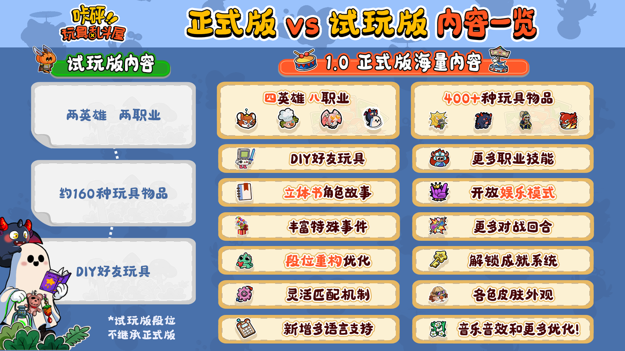 在之前的发售日公告中,我们介绍了正式版将带来4个风格迥异的英雄角色和多达8种职业,并且首发阵容将扩编至至少400+种天马行空的玩具兵种、技能法术和武器。下图我们对比了试玩版和正式版海量内容的具体差异,给大家提供更直观的细节——