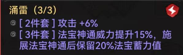 - 涌雷套(五速辅助):被动“释放技能后,自身法宝蓄力进度+30%”,搭配「风灵」的蓄力加成,五速辅助的法宝循环周期缩短至1.5回合,能频繁触发二阶木的增伤或续航效果,是“循环加速器”;