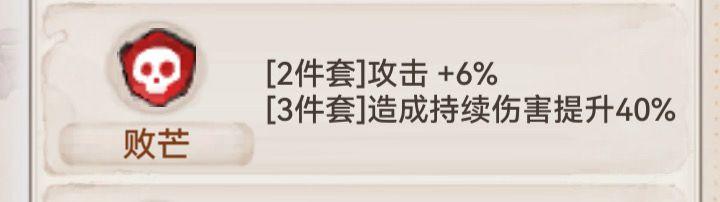 - 败芒套(主C):专属持续输出的套装,被动“每次攻击敌方叠加2%增伤,最多叠加10层”,与「烟花残火」的多目标挂DOT机制契合,战斗时间越长,主C伤害越高,后期叠满增伤后DOT伤害翻倍;