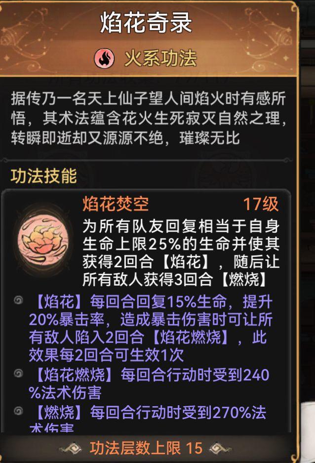 - 主C「烟花残火」:游戏中持续伤害倍率最高的蛊系技能,DOT持续3回合,叠加3层后总伤害堪比爆发技能,搭配养蛊天命和败芒套(持续伤害+40%),形成“技能+天命+装备”的三重DOT增幅;
