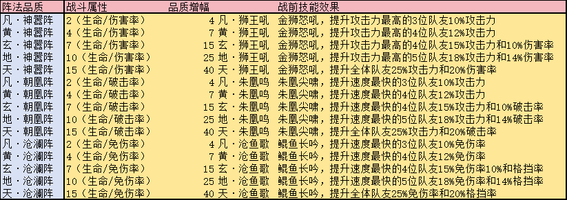 2、阵法属性包括基础面板属性(阵法升级、阵眼升级、奇门属性)、阵法收益属性(阵法突破带来的属性经过增幅进入战斗生效)和战前技能(不同品质效果目标不同)