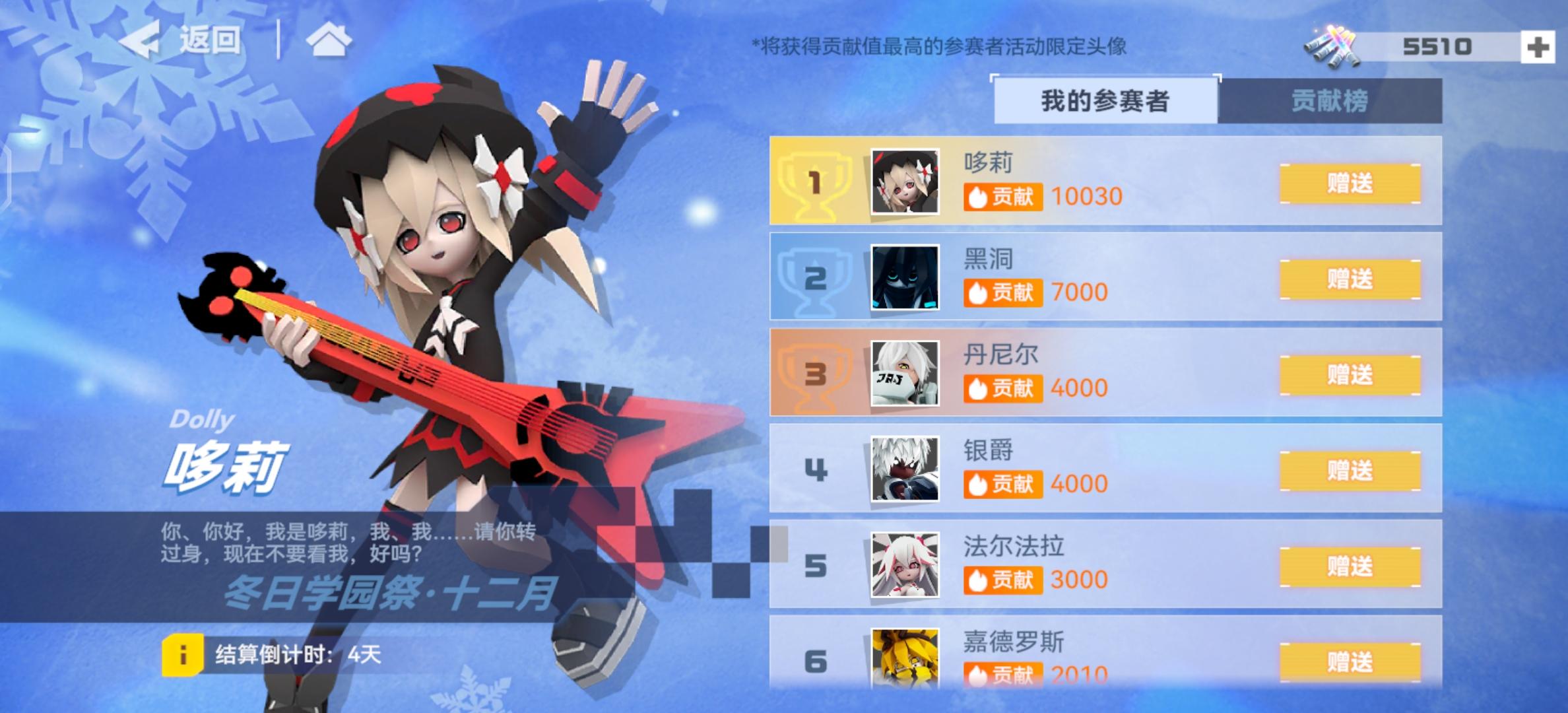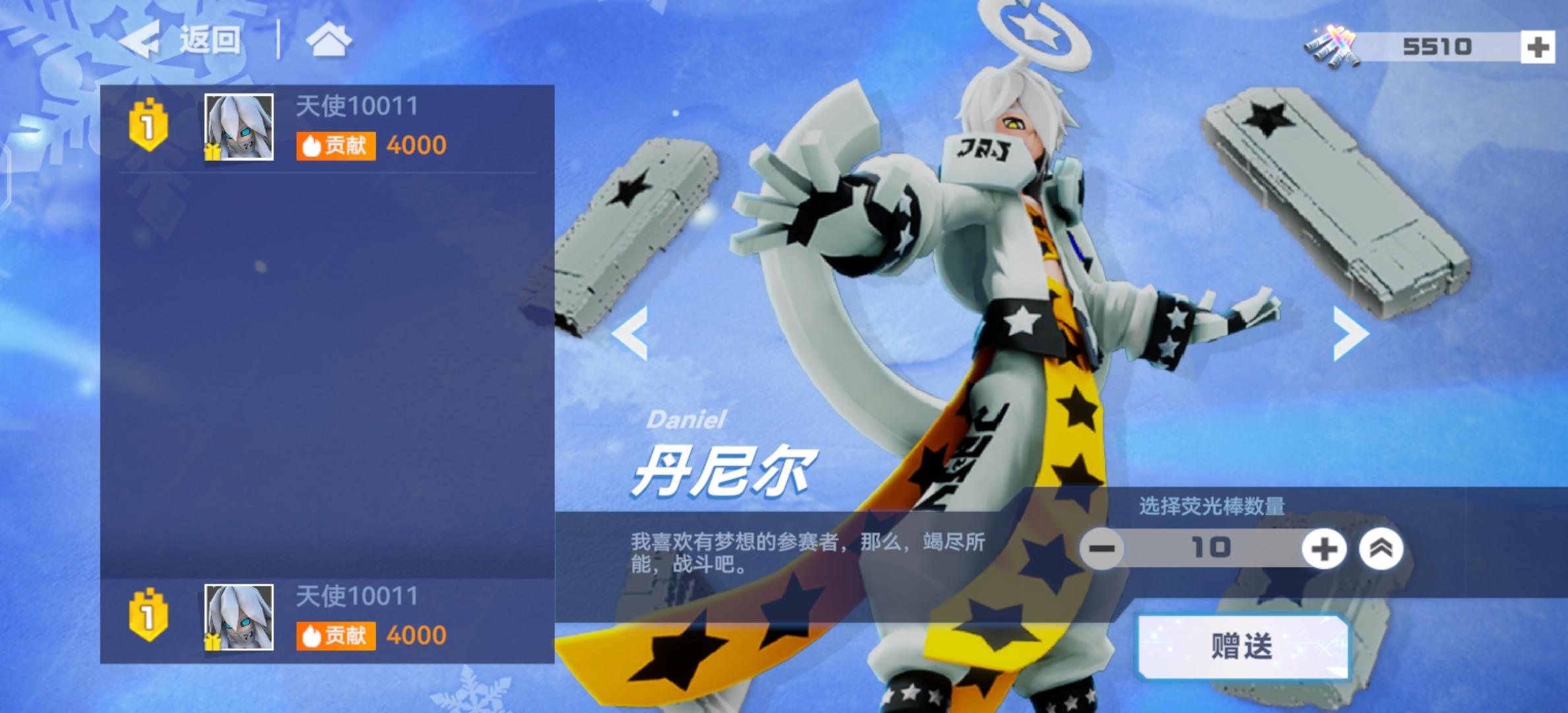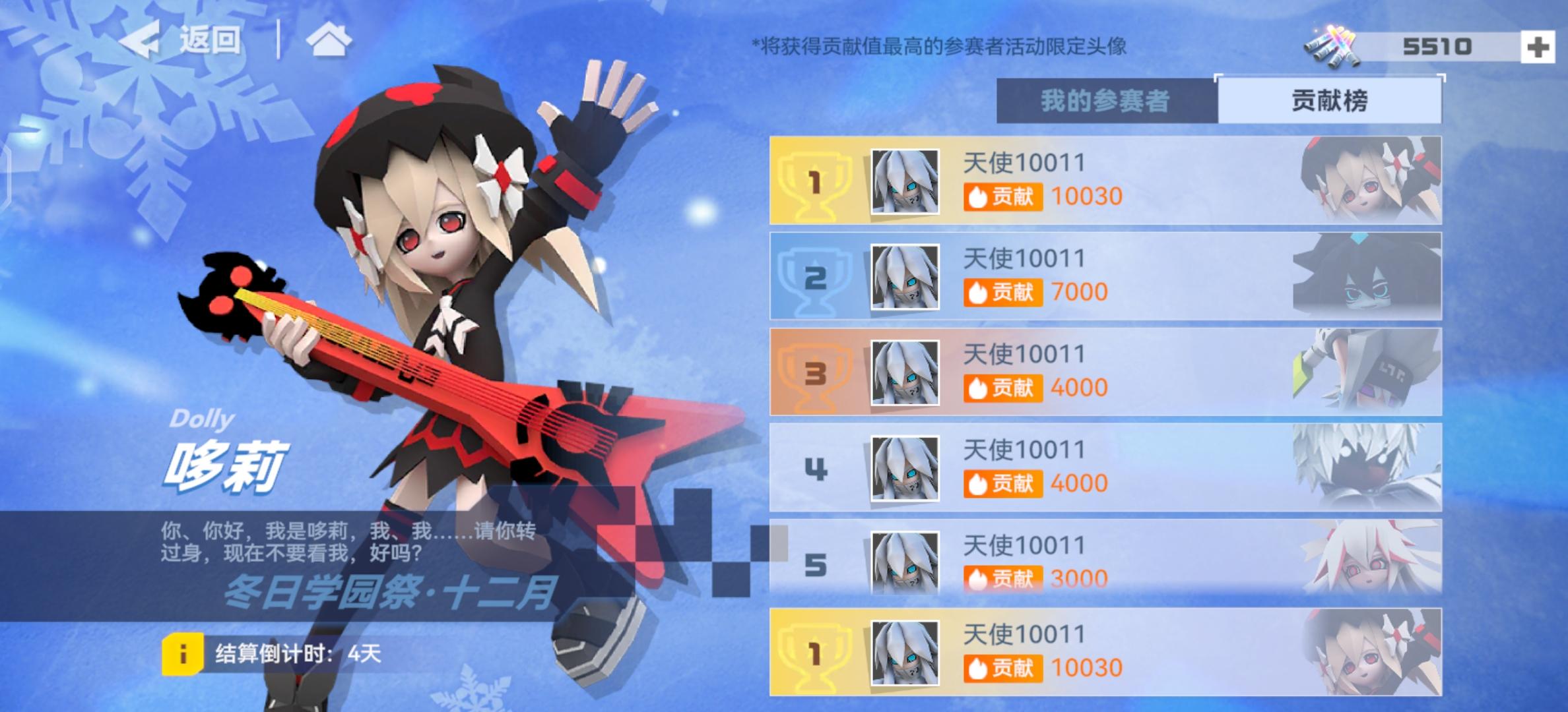 【活动内容】收集荧光棒,赠送给你喜爱的参赛者吧!本次冬日学园祭分为两个模块,分别是“我的参赛者”和“贡献榜”。在“我的参赛者”界面中,天使们可以看到所有参赛者,以及为每位参赛者投入的贡献值。