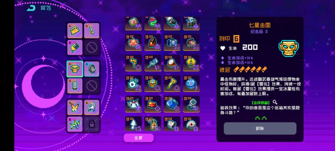 其实还可以再极限一点。尽量兼顾前期舒适度和后期伤害。带七星面具是为了吃40暴伤,其实意思不大,可以换成电刀的道具,提升前期舒适度。