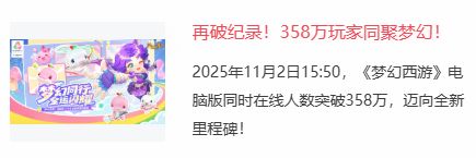 7月6日,275万;8月3日,293万;9月7日,315万;11月2日,358万——四个月的时间里,网易《梦幻西游》电脑版连续四度官宣同时在线人数打破历史记录。