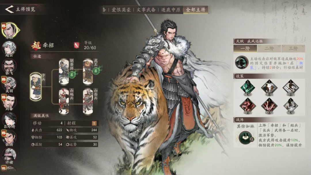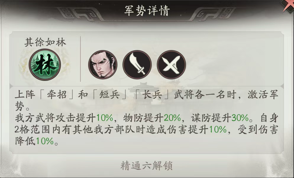 牵招是拥有阵眼的超级别短兵/长兵系主将。可与一名短兵武将+一名长兵武将激活军势【其徐如林】,提供攻防增益之余,自身2格范围内有我方部队时,可额外获得10%的伤害提升和10%免伤加成。
