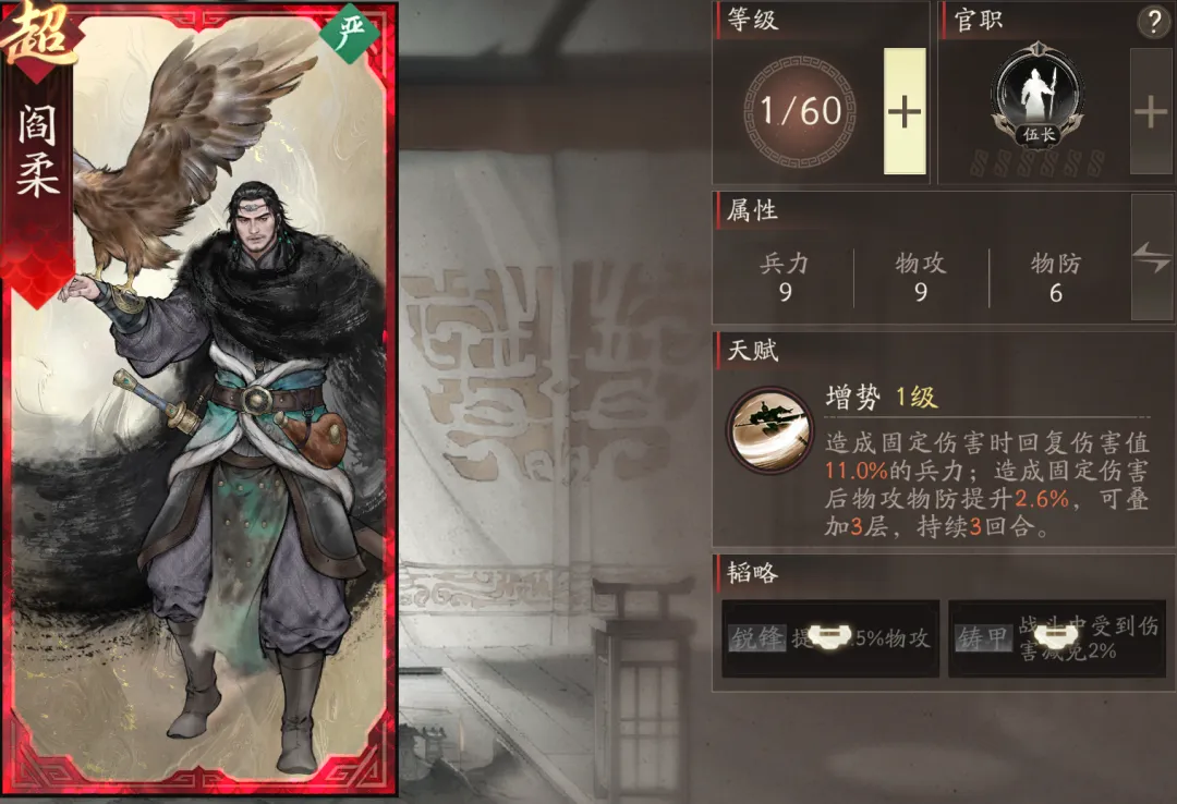专属副将阎柔,在造成固定伤害后,可以让牵招回复血量,5星牵招配合天赋的攻心效果、生存能力更加,另外还能提升牵招需求度高的物攻与与物防面板,提升自身固伤等输出的同时,补强自身的生存能力。