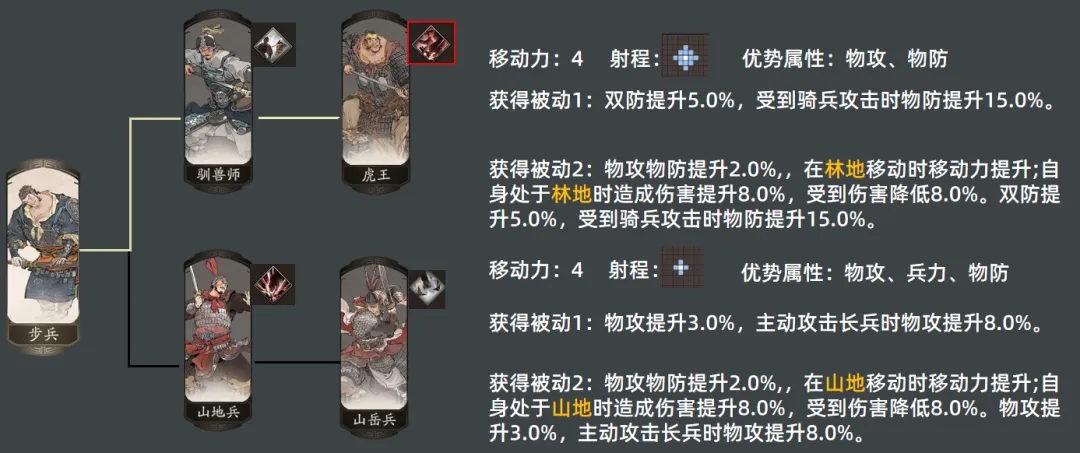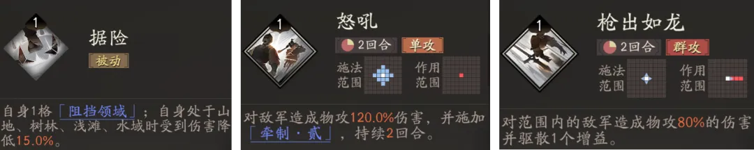 通常镇军戍边、绞杀殆尽两个升阶技能为主,第三技能可以选择群攻技能枪出如龙或单点技能怒吼;部分多特殊地形、抗伤压力大,第三技能位也可以带据险。