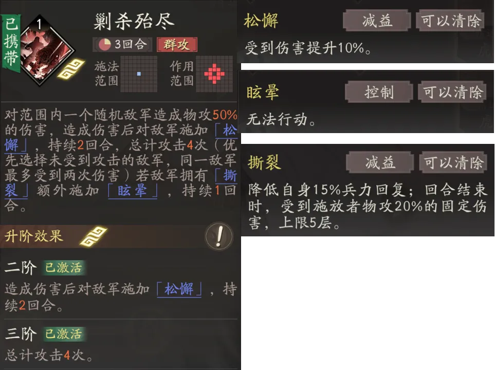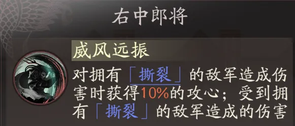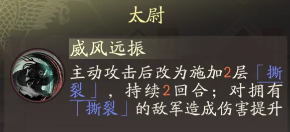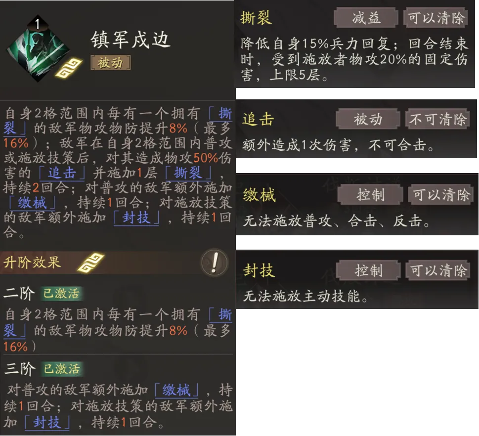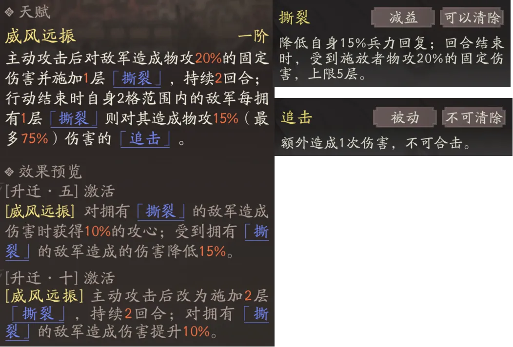 牵招本体1阶、即可激活该技能的二阶效果,可以依据周围有无撕裂状态敌军提升自身攻防,有两名有撕裂状态的敌军,就可获得最大16%的攻防提升,等于直接提升牵招的物抗能力、固伤数值。