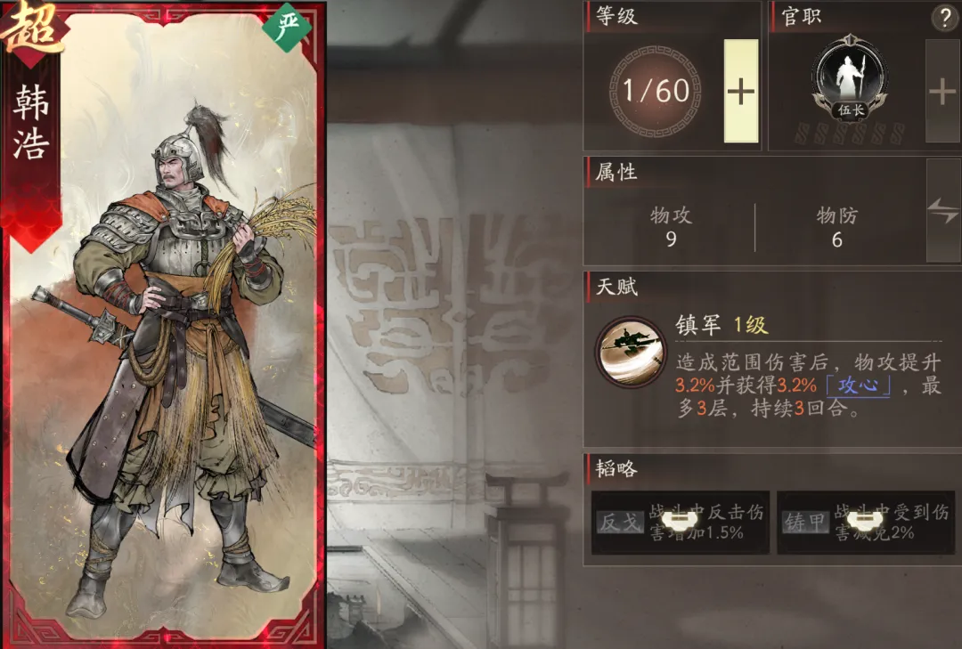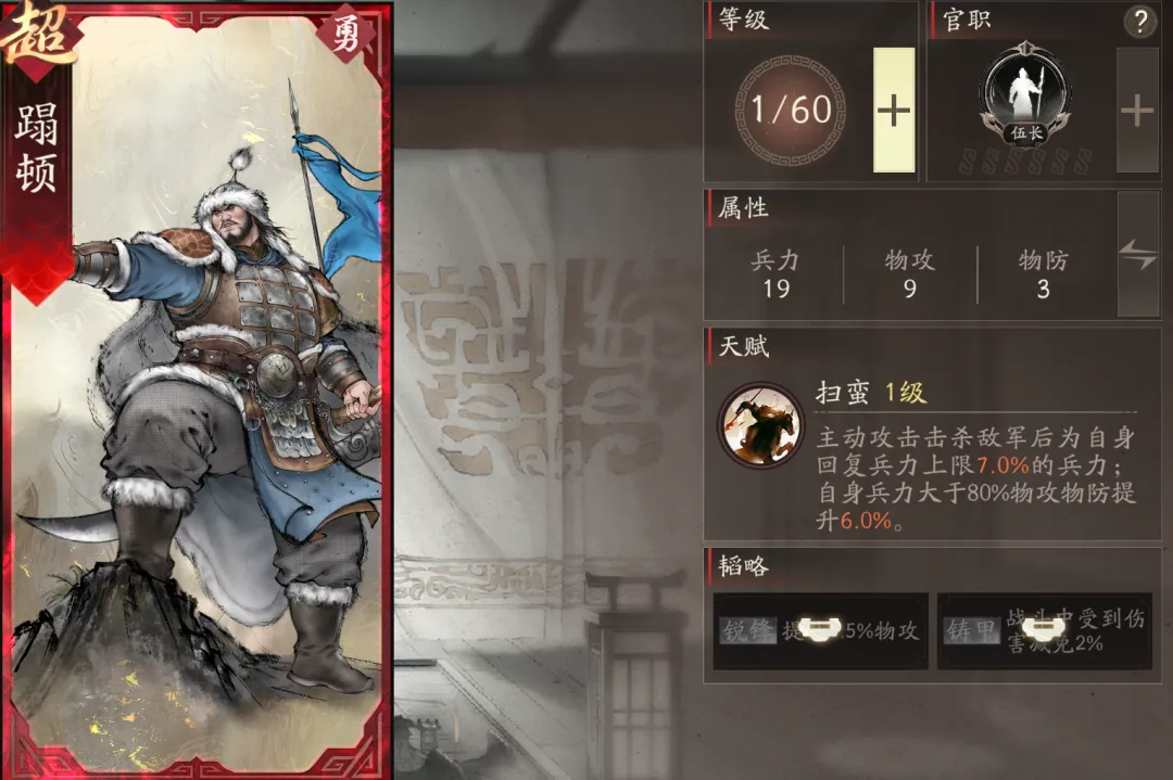 先说一下牵招最主要的问题,就是他非常吃练度,低星牵招,不像张飞自带各种减伤、控制,也不像赵云有逆天的格挡机制,低星就能有不错的手感;低星、低兵营、低面板的牵招,固伤刮不出多少伤害、站也站不住,只能当一个眩晕工具人使用。如果你资源有限、不太好多抽几个牵招本体、无法安排刷星位让他尽早到达5星,只抽一个牵招本体很难用出牵招的效果和作用、基本上要当仓管了,这种情况等后续需求武将即可,不用强抽0星牵招。