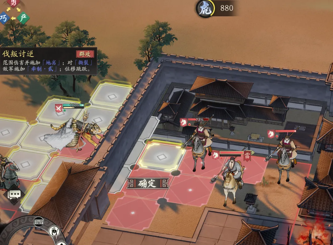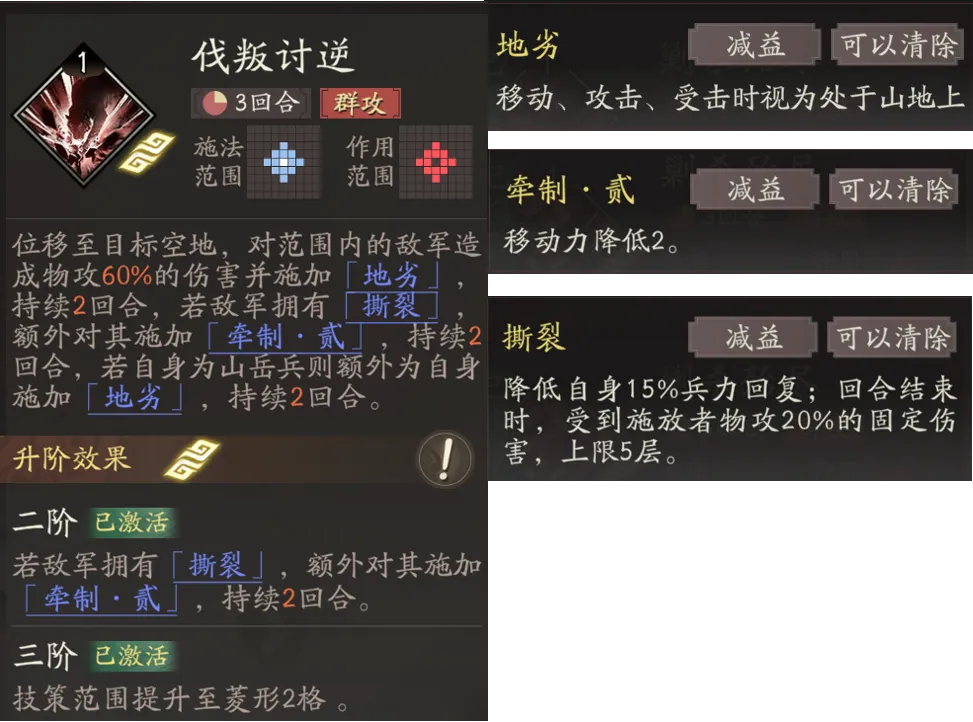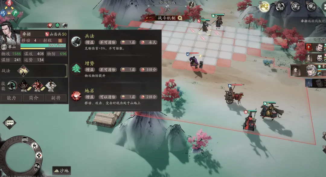 *上图释放伐叛讨逆后、吃到山劣地形加成,可以走5格、同时获得被动2的增减伤效果。