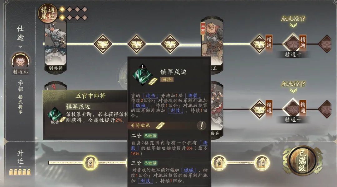 由于牵招其余两个升阶技能:被动技能镇军戍边、绞杀殆尽实用性更高,在刀兵线的伐叛讨逆不拿或不升阶也可。