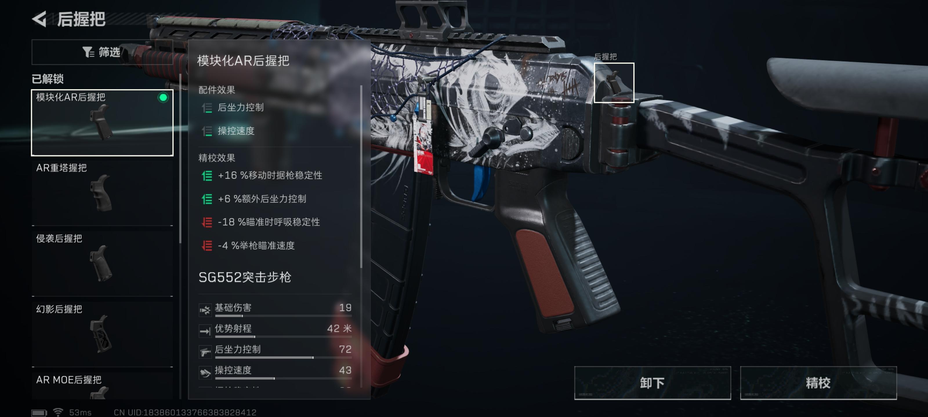 枪管、前握把、后握把、枪托的精校全部向右拉满。可以进一步提升枪械的稳定性,在实战测试中能够拥有更好的表现在靶场测试中压枪更稳。