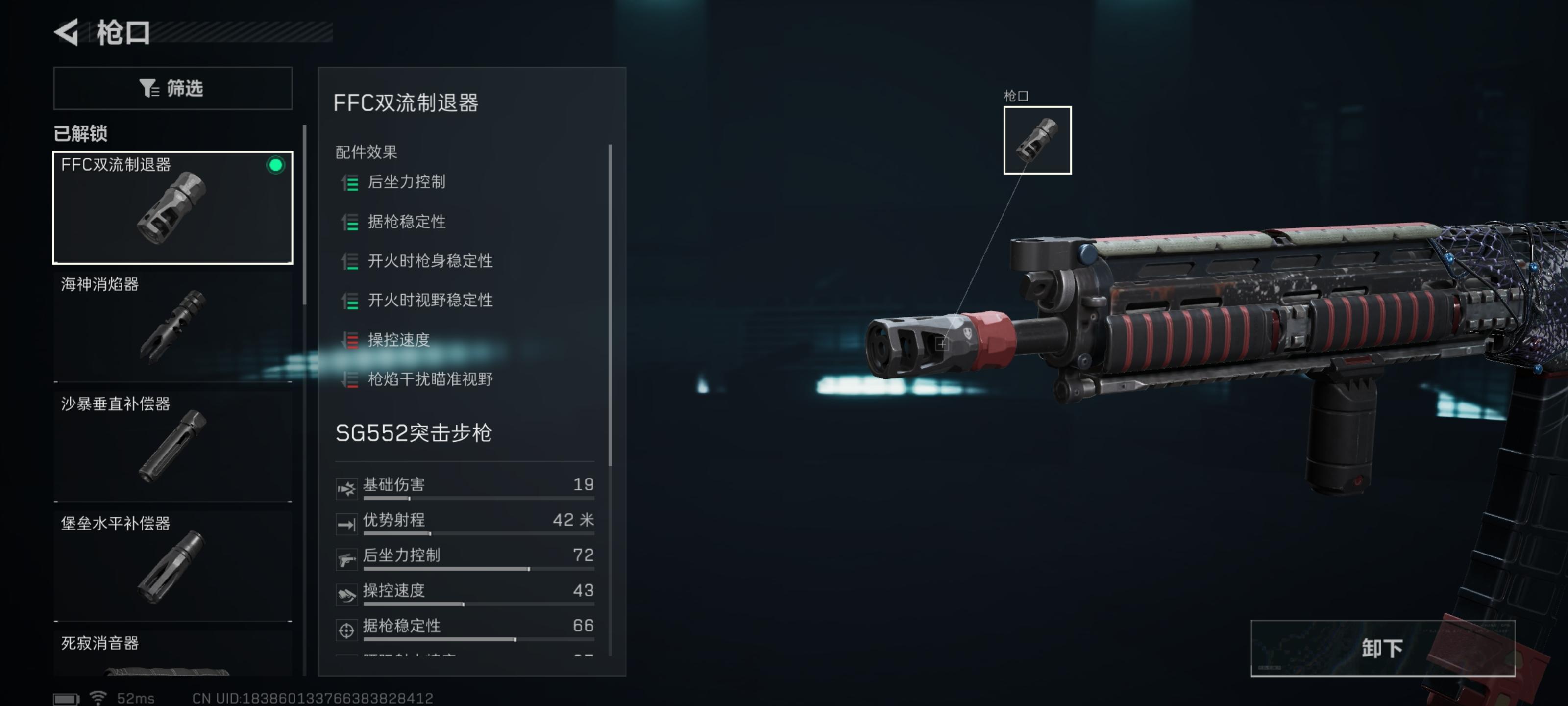 枪口选择FFC双流制退器。这个枪口作为本赛季需要解锁的枪口,虽然中幅度减少了操控速度对于操控速度61可以忽略不计,但是对于枪械的后坐力控制、据枪稳定性等属性确实不错的选择。
