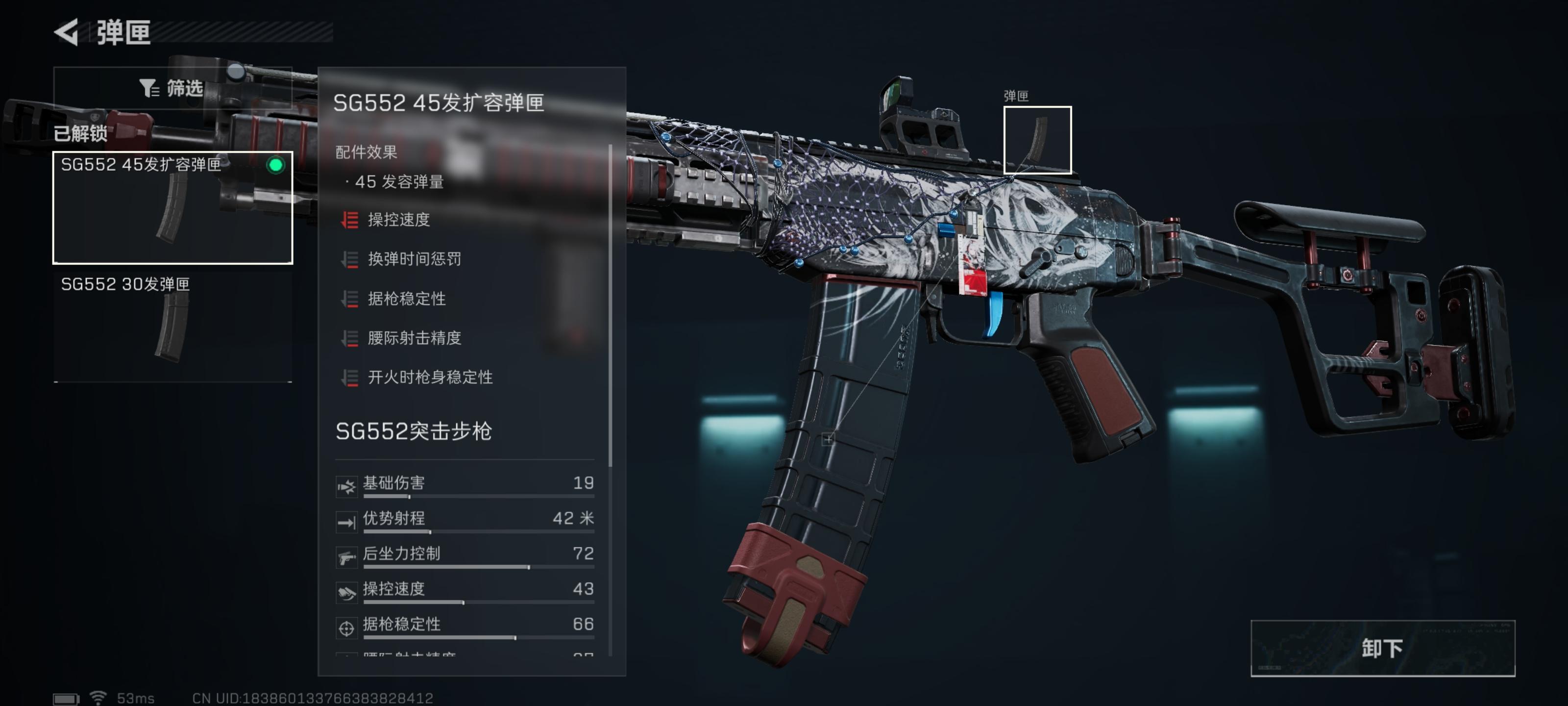 弹夹选择SG552 45发扩容弹匣。选择这个弹匣可以提升容错率,以及续航能力虽然有很大的负面属性,但是可以通过后续配件可以忽略不计。