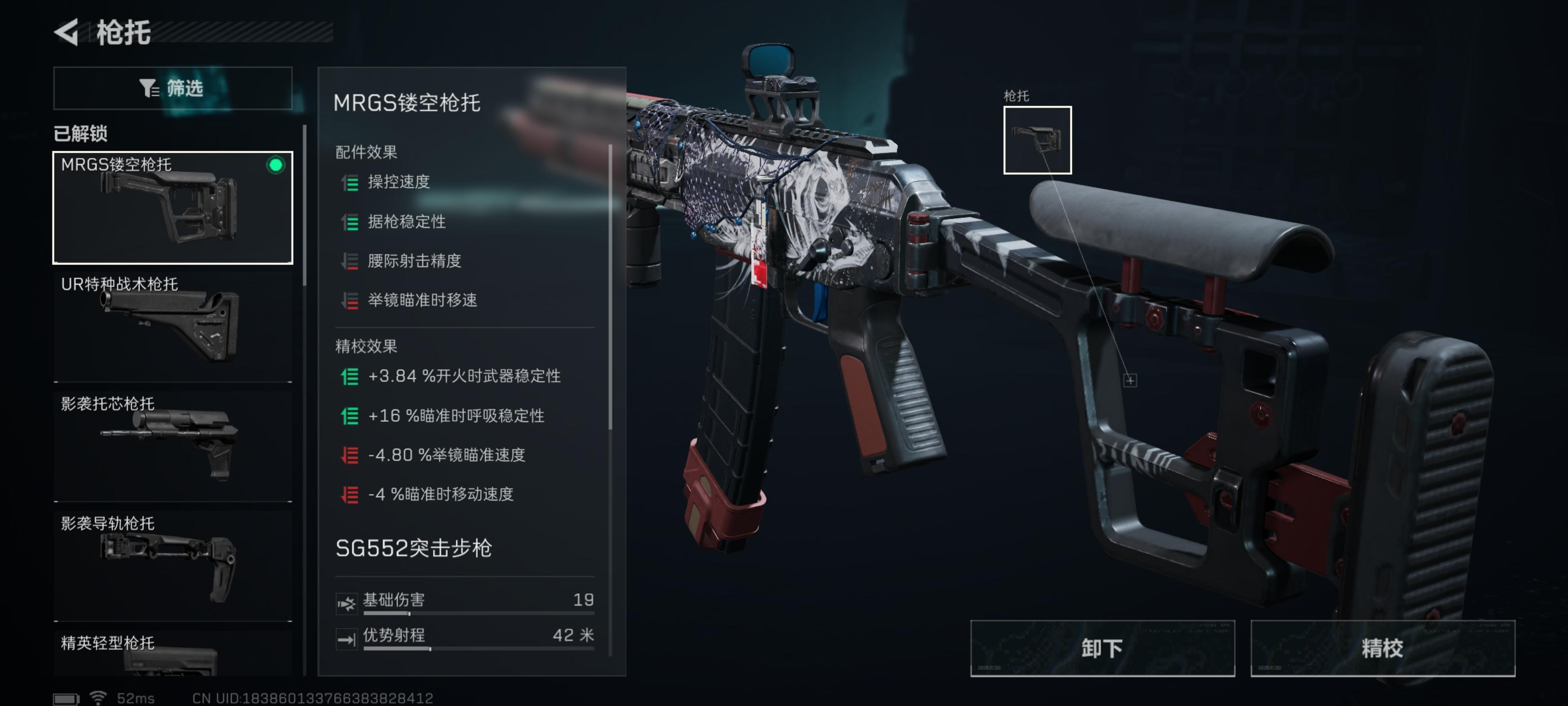 枪托选择MRG5镂空枪托。这个枪管枪托在减少腰际射击精准度以及举枪瞄准速度的前提下,大幅度增加操控速度以及据枪稳定性。接下来是枪械精校: