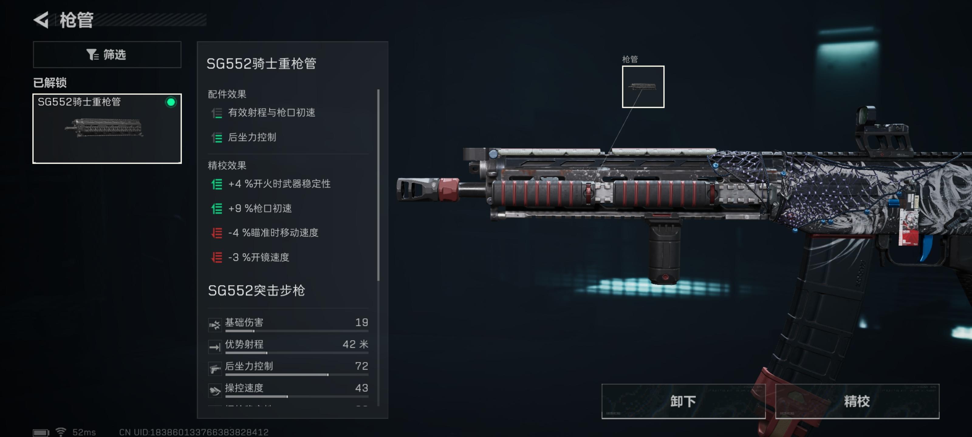 枪管选择唯一的SG552骑士重枪管。这个枪管在没有负面属性的情况下,可以提升枪械稳定性的前提下增加射程以及枪口初速。