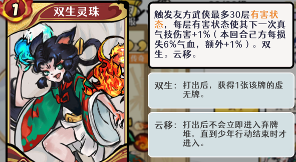 灵童武学:双生灵珠这张武学卡打出时需要控制己方身上有灼烧,同时血量损失越多收益越大,正常情况5层灼烧,血量控制在50%左右使用,会有5*(1+50%/6%)约等于50层左右的真气增伤。