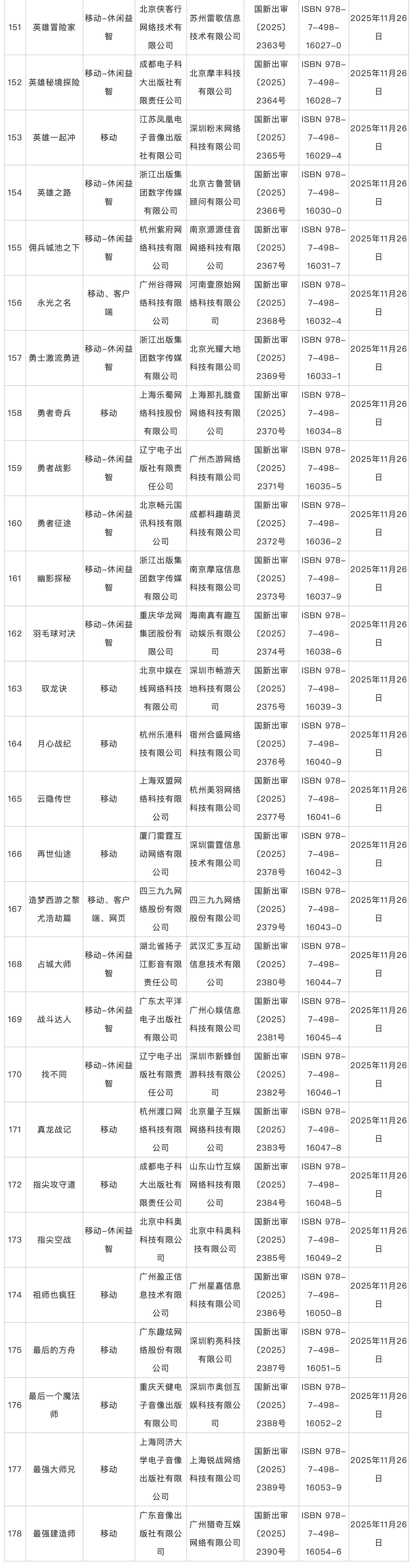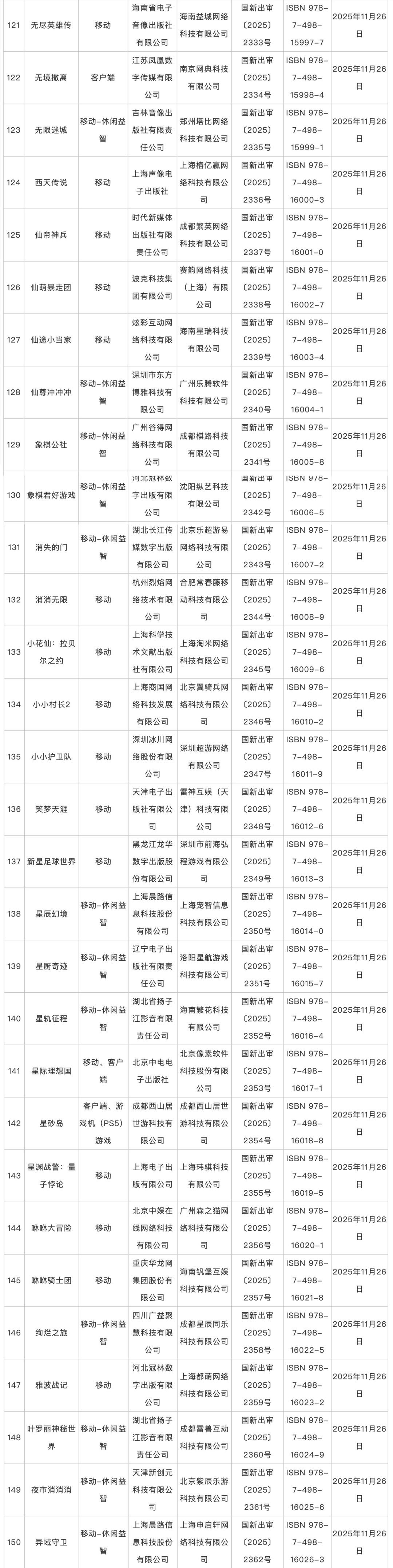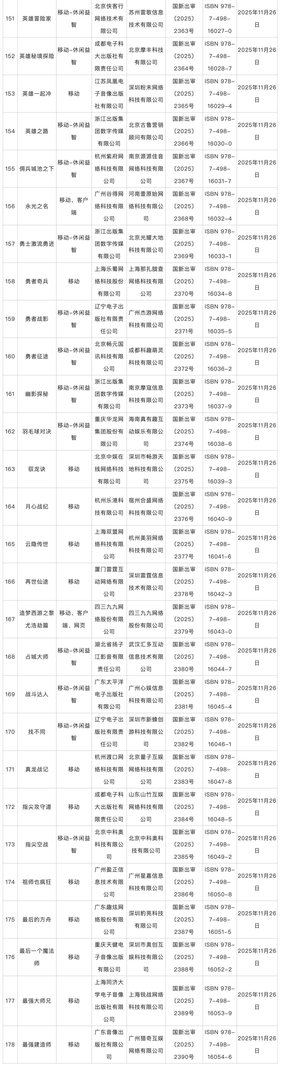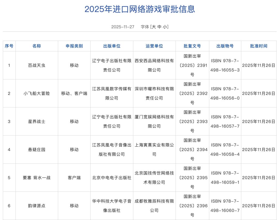 2025年11月版号发放,共6款进口游戏、178款国产游戏,《Arcaea(韵律源点)》《生物原型2》《世上英雄》《星砂岛》等游戏过审。