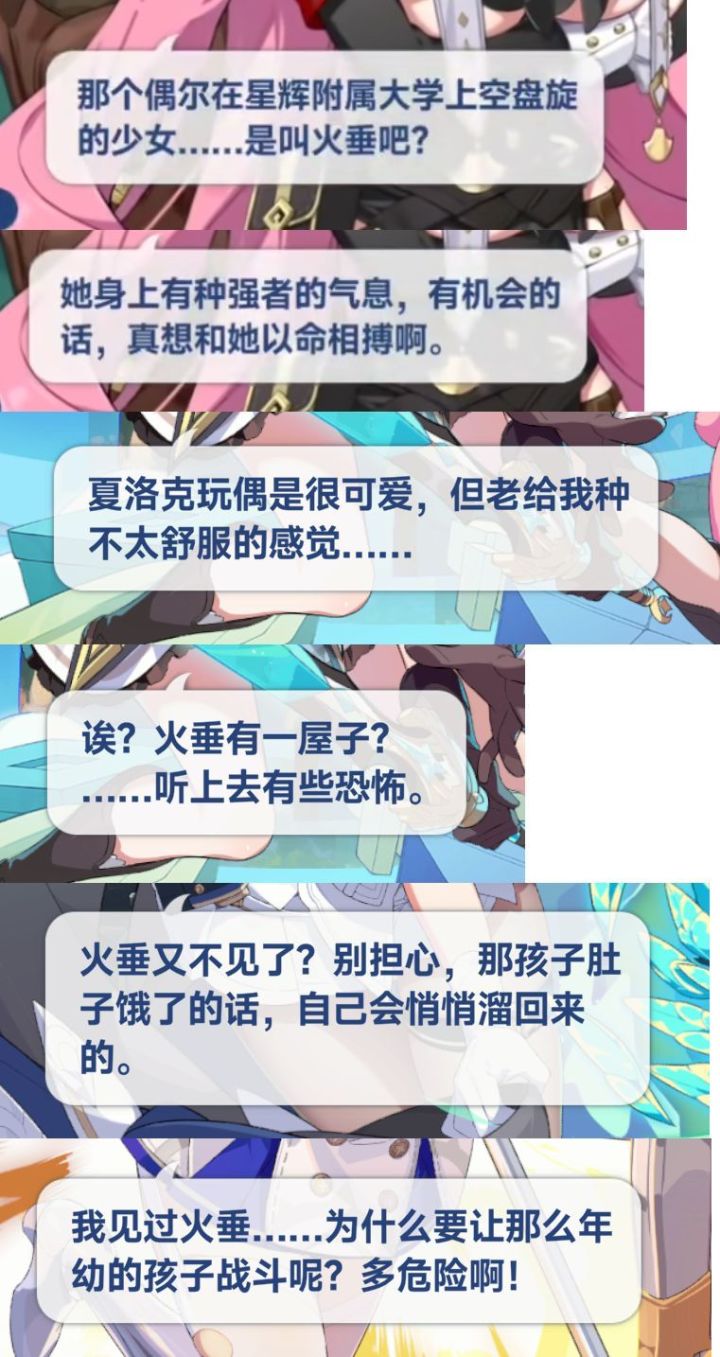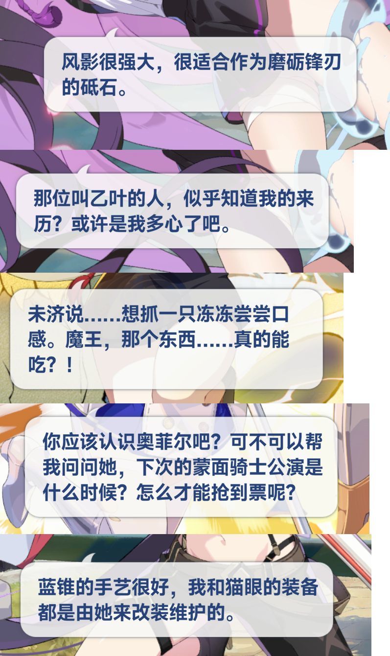 从角色评价语音整理出的卫星角色官方名称,有老朋友也有新角色:翡冷翠,猫眼,火垂,多娜,星雁,青叶,风影,乙叶,未济,奥尔菲,蓝锥,还有之前秘纹故事里的安琪,奥尔贝德,因为我角色和秘纹也不全,所以可能有遗漏