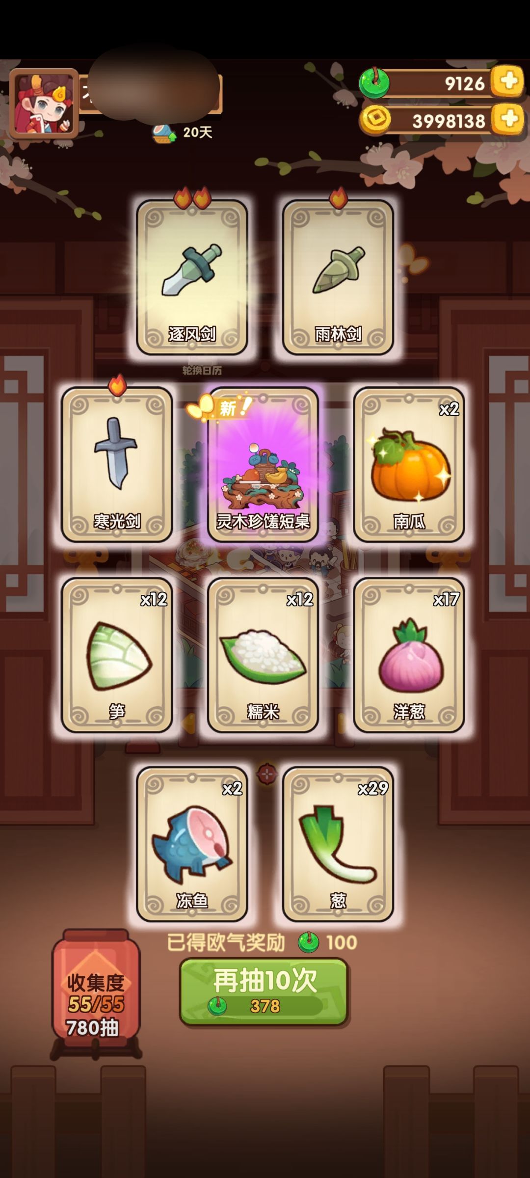 抽的时候好几次出两个家具还心疼每次亏100玉,结果看了论坛发现自己抽完算是比较提前的了。53出菜,62出厨师,当时只剩一菜一厨和家具了,68抽完所有菜和厨师剩3家具,78毕业。