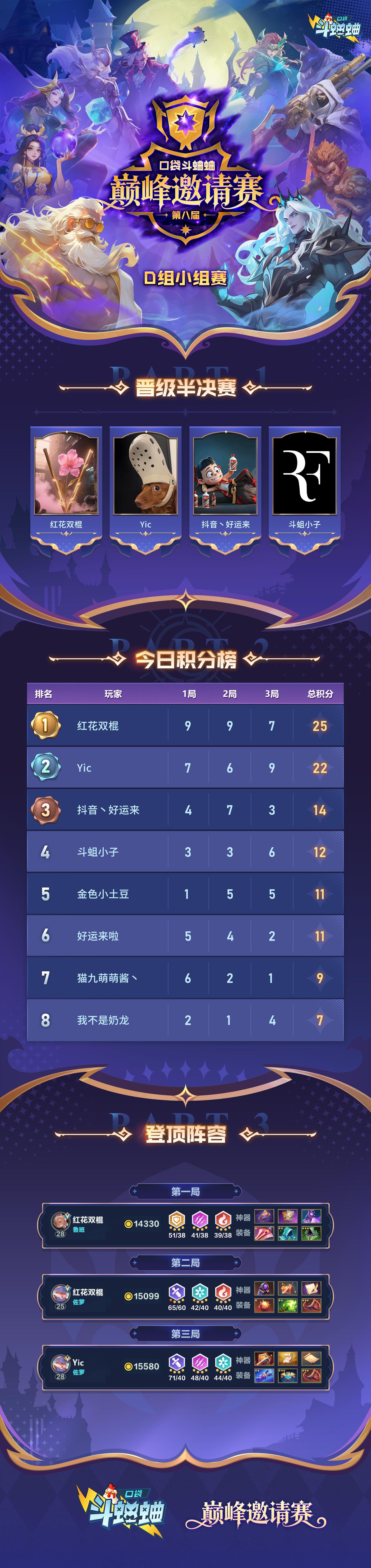 「D组」晋级选手为红花双棍 、Yic、 抖音丶好运来 、斗蛆小子