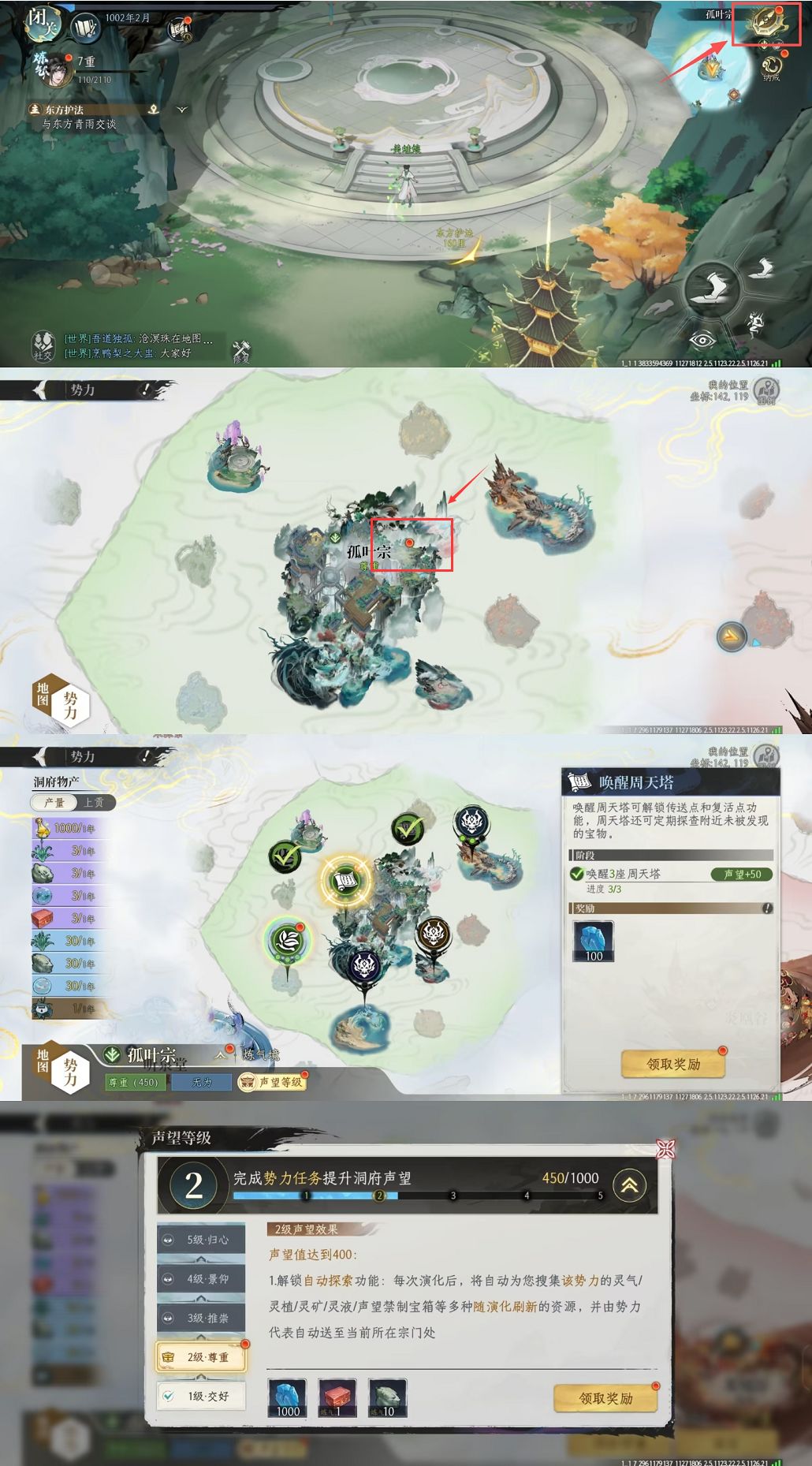宗门和城市等势力(例如孤叶宗)都有专属的势力声望等级和声望任务,达到特定声望等级之后,每次演化都会有大量修炼资源自动上贡。