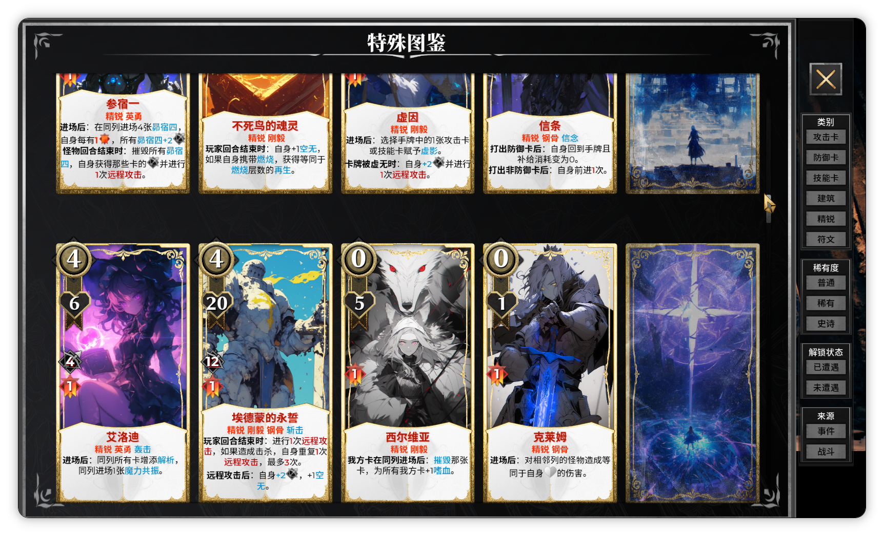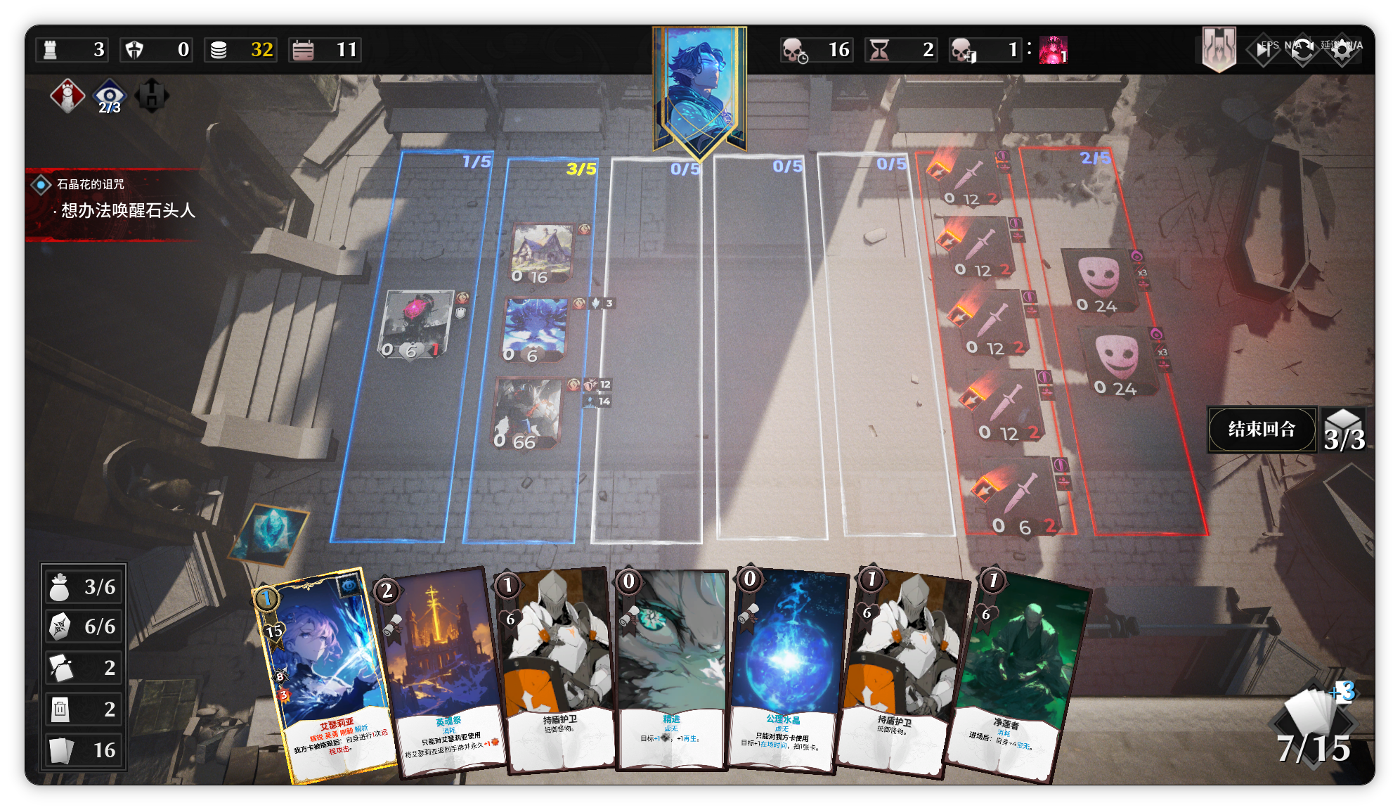 除了解锁常规牌组,你还可以在每天备战时消耗补给推进事件来解锁特殊卡,比如随机遭遇的战斗“石晶花的诅咒”中,我们需要保证石头人存活17回合直到其解除石化,从而在当局游戏中获得史诗品质的精锐卡“埃德蒙的永誓”。