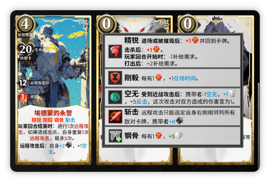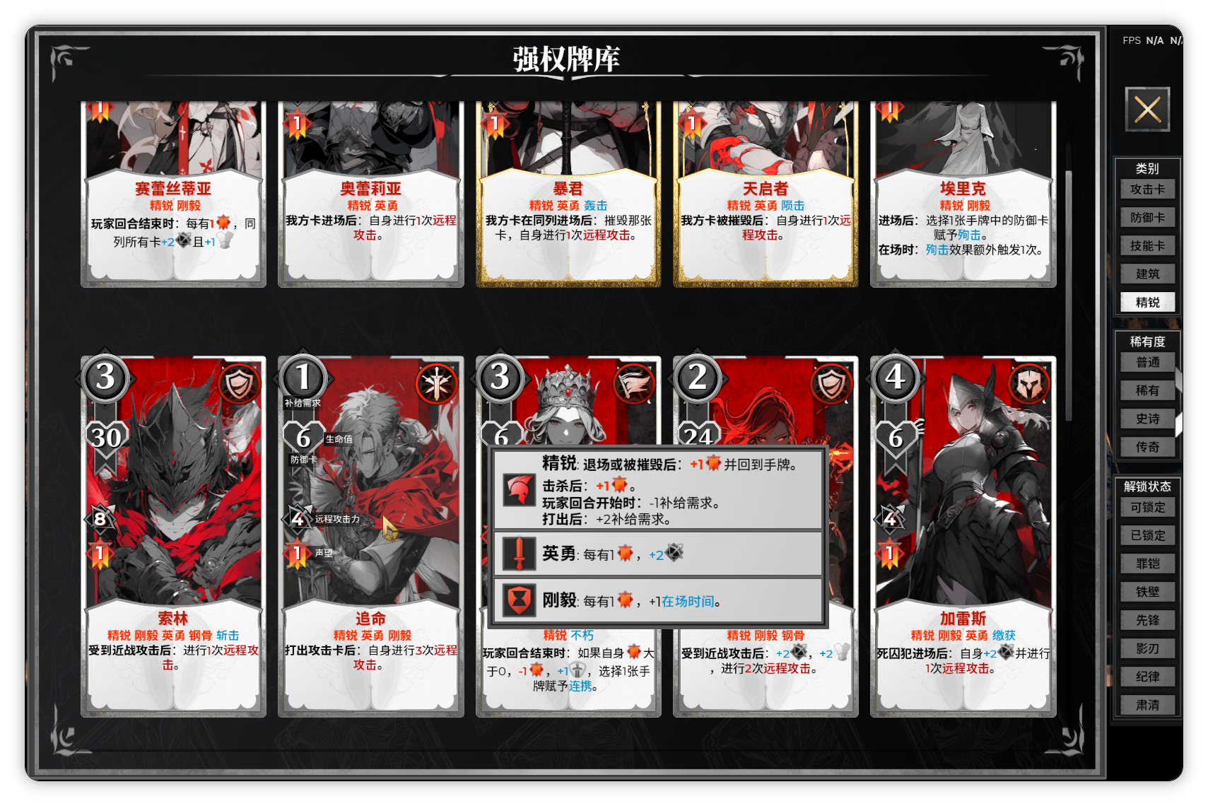 游戏的卡牌类型共有五大类,分别是攻击、防御、技能、建筑和精锐。其中精锐卡属于防御卡中的特殊卡,也就是这游戏的核心玩法——养大哥。精锐在退场、被摧毁以及击杀地方单位后可以提升当局内声望,声望越高,卡牌加成效果越高。除了少数超模的建筑卡和机制外,不断提高精锐卡的声望是游戏通关的主要方式。
