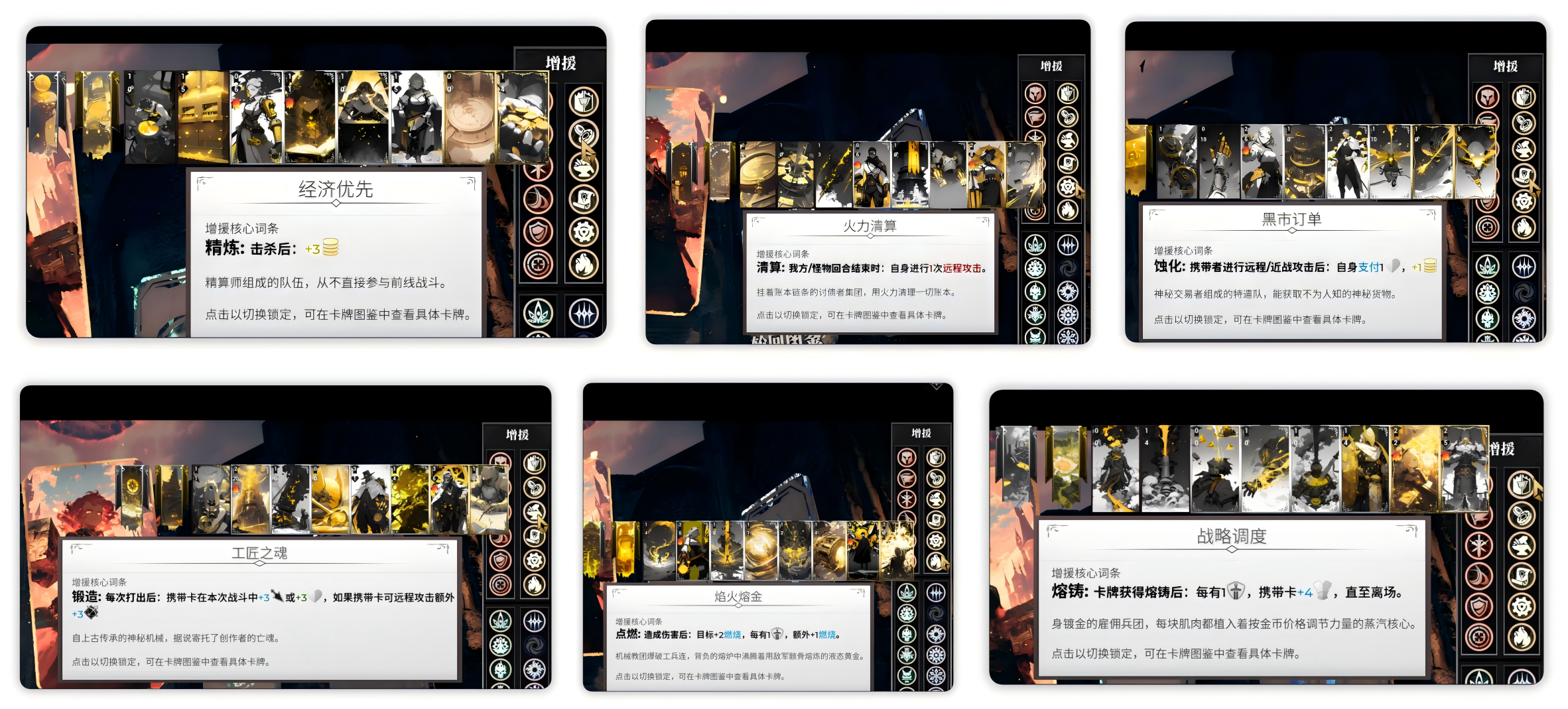 目前游戏共有四大基础流派:强权流派擅长堆叠武装强化单体战力,金手流派依靠经济优势碾压对手,公理流派掌控时间规则实现连环控制,轮回流派则通过卡牌循环创造无限combo。每个流派在基础牌库的基础上又新增了6个特殊流派,以金手为例,包含经济优先、火力清算、黑市订单、工匠之魂、焰火熔金和战略调度等风格迥异的牌组。