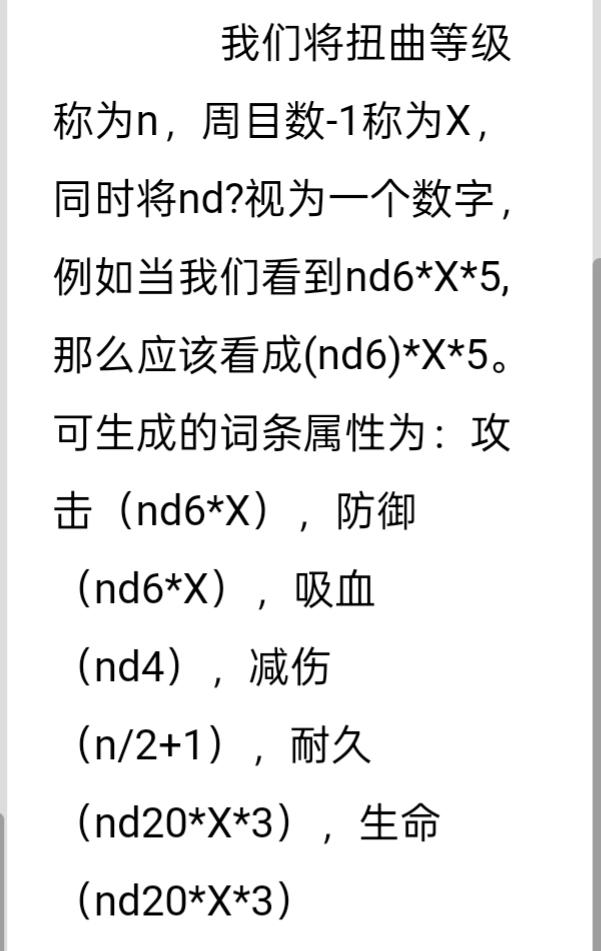 比如假设扭曲等级为1,在2周目,我们随机到攻击词条时,得到(1d6)*1的攻击力。也就是1~6点攻击。而假设扭曲等级为8,3周目,我们就会得到(8d6)*2的攻击力,也就是16~96点攻击。