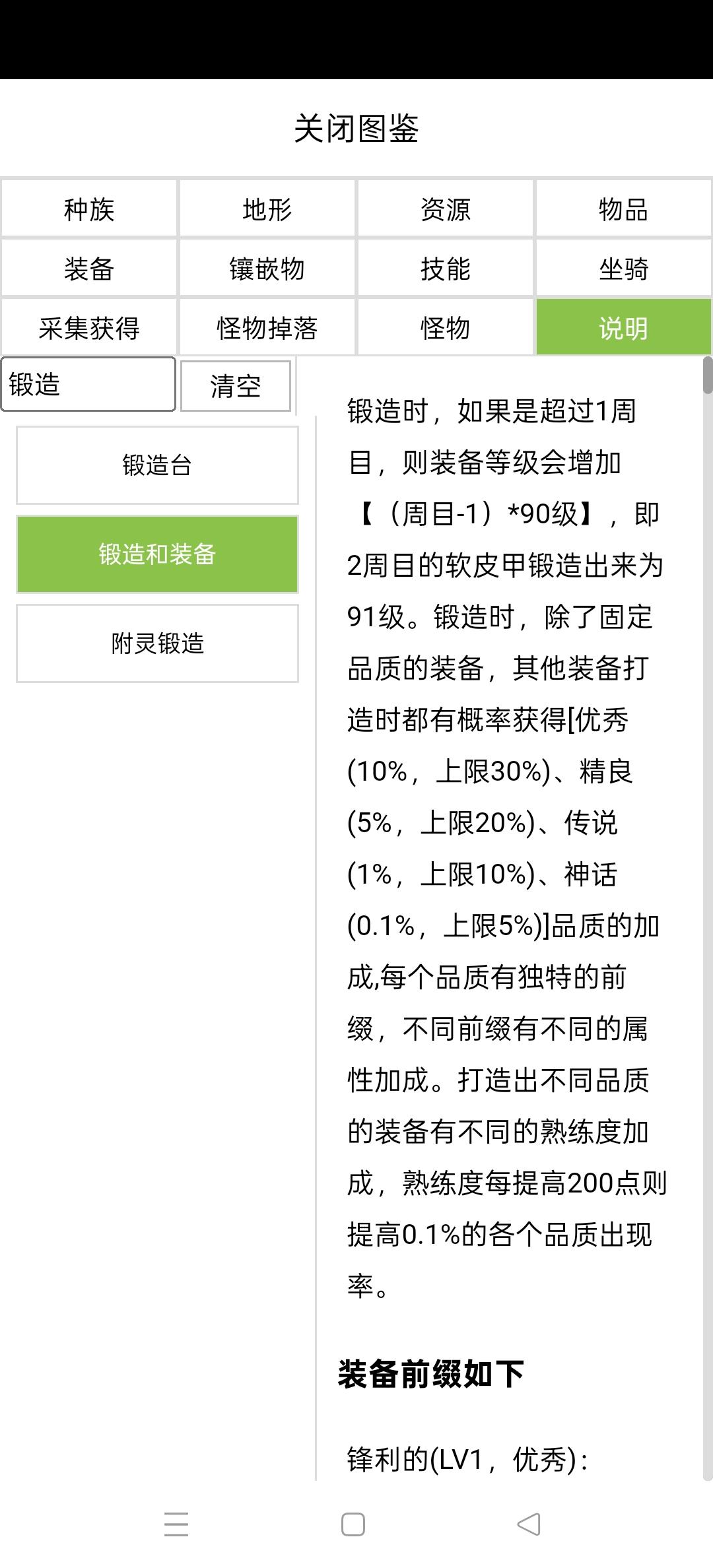 图鉴下方也详细描写了各种词条的属性。我简单总结了一下,优秀词条是单加成,攻击/防御/耐久三选一;而其他品质是双加成,也就是攻击防御耐久三选二。也就是说精良品质及以上品质有概率同时锻造出攻击和防御的词条加成。