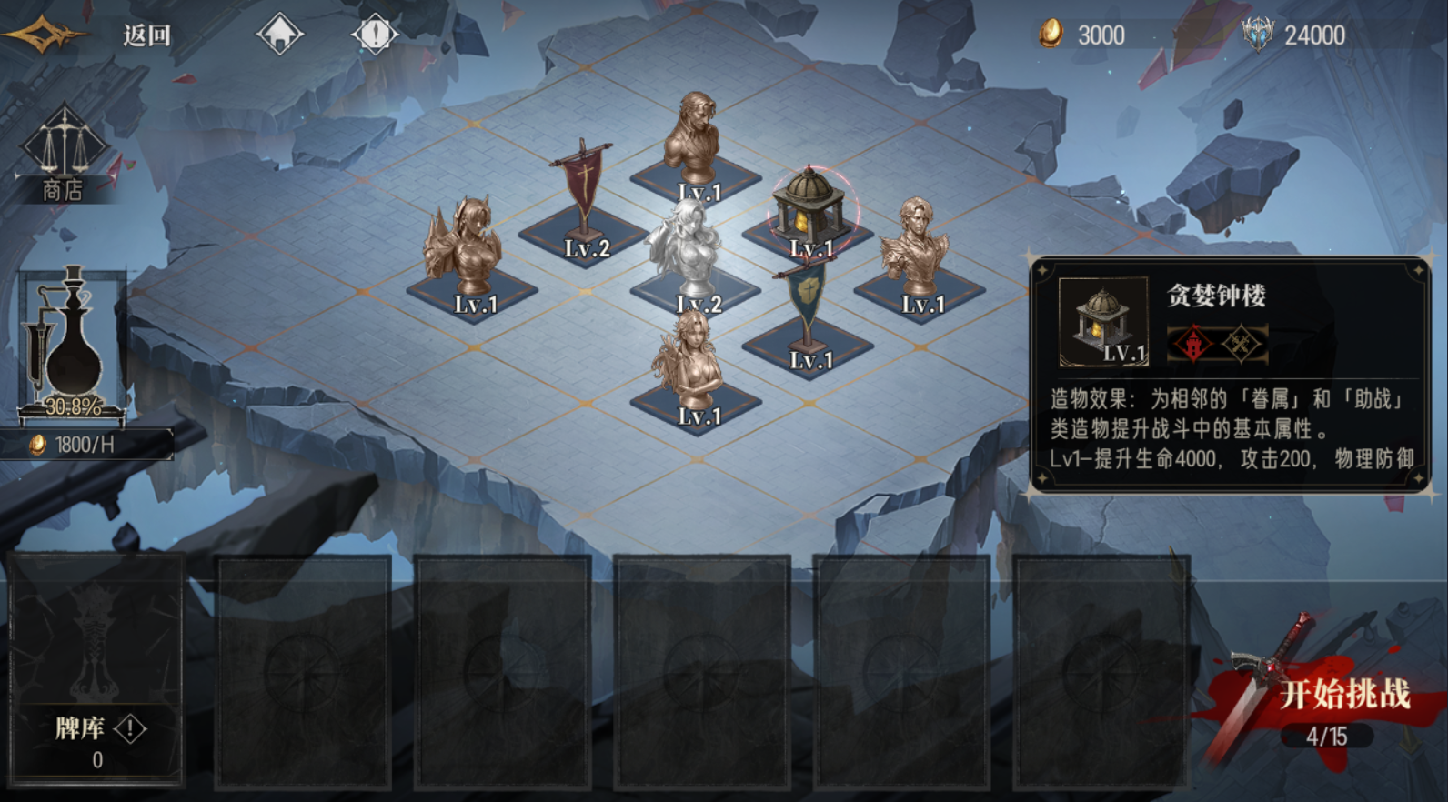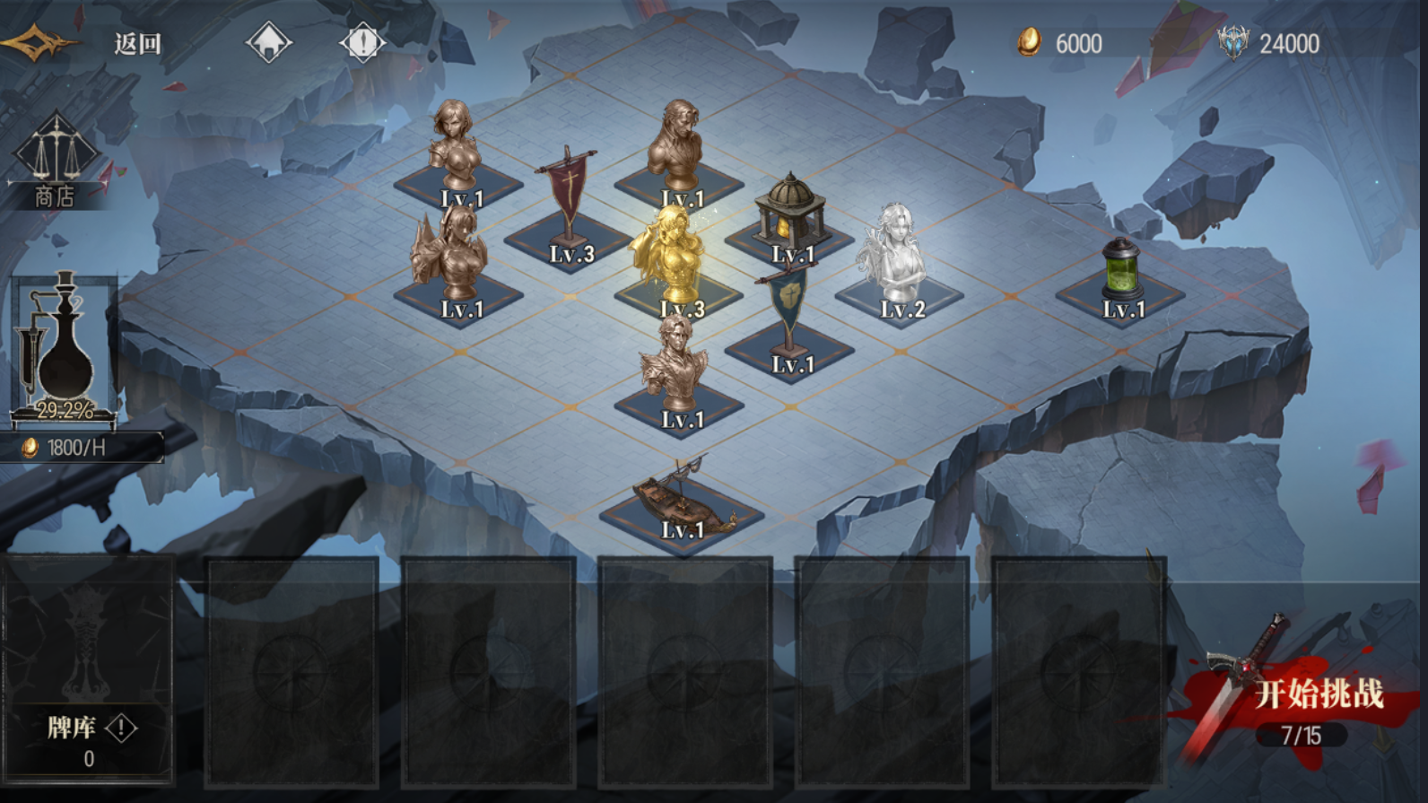 起始有4张造物牌,在关卡挑战胜利后会掉落卡牌,我们可以基于需求进行选择(下文会给大家介绍选择优先级)。除了胜利掉落外,还可消耗液态金在商店中兑换。*商店每天4点自动刷新,也可消耗液态金手动刷新,废卡可以出售、返还液态金。可利用液态金购买造物快速提升强度。