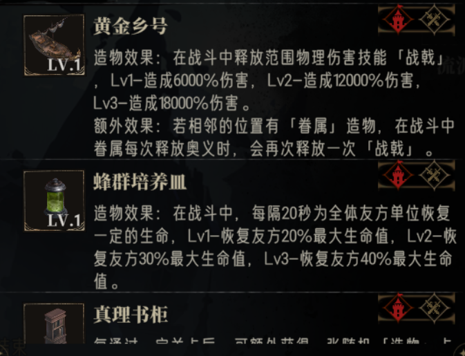 部分场景造物拥有双重效果,例如黄金乡号可造成范围物理伤害,如果相邻位置有眷属,战斗中眷属每次释放奥义都能额外释放一次技能。黄金乡号是蚀骨利刃流派核心造物,输出嘎嘎猛(建议优先获取与升级),搭配阿伽莎聚怪、易伤,一次可打出巨额伤害。