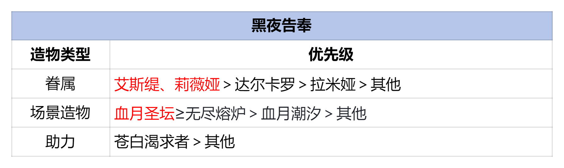 眷属优先升级艾斯缇、莉薇娅,场景造物优先选择血月圣坛、无尽熔炉提升核心位输出。黑夜告奉与蚀骨利刃一起用,可以额外选择贪婪钟楼提升双C的全属性数值,队伍需要血魂回复、生命恢复,所以如果有刷出风车磨坊、蜂群培养皿,也要选。
