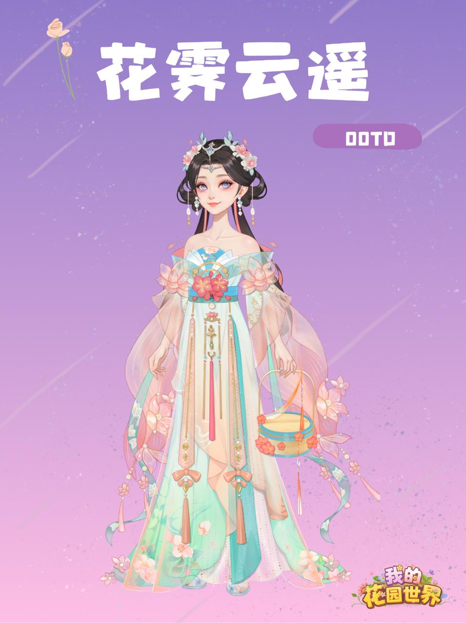 ✨【花霁云遥】:衣裙以浅粉与薄荷绿为主调,缀以淡蓝,清新如初绽之花。发间粉白花卉与流苏步摇相映,裙摆落花轻扬,手持绘花竹篮,宛若画中仙。