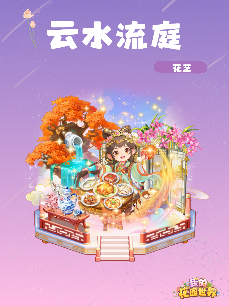 🍁【花宴流芳】:珍馐满桌,香气缭绕;枫红似火,映照琼浆自青瓷间潺潺流淌。金色星光点缀其间,勾勒出一场如梦似幻的仙境盛宴,尽显中式雅韵。
