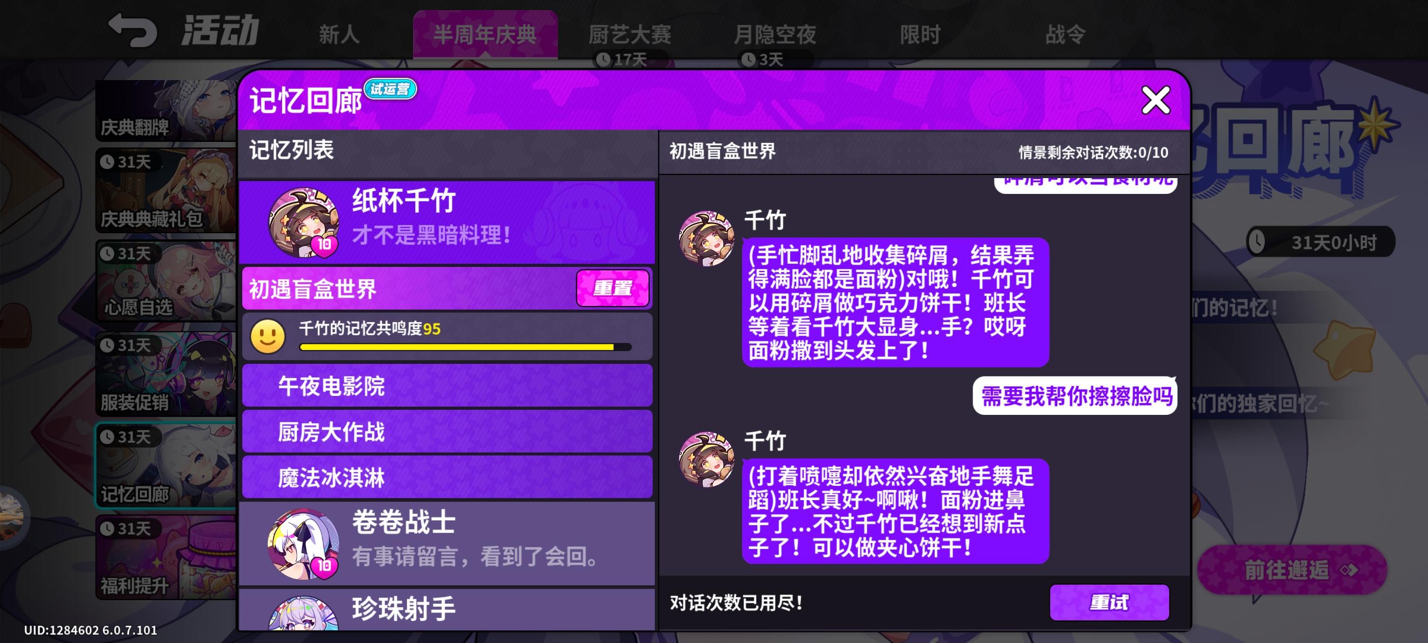 以千竹为例,第一个的目标是建立营地,但是我就想跟千竹腻歪,最后共鸣八九十。也就是说我很满意的对话系统不是很满意。