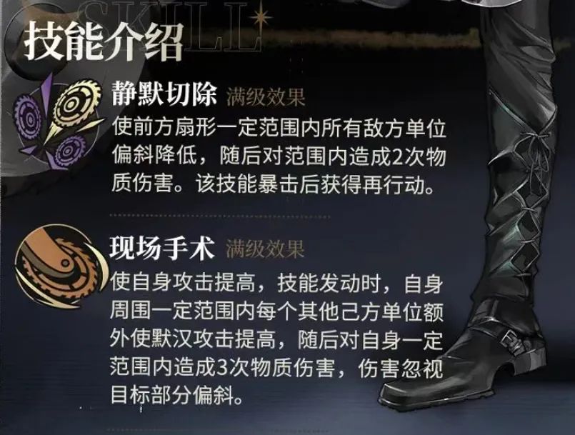 然后默汉的两个技能就很有意思了,这里的描述看起来真是很唬人对吧,技能一具备大范围伤害+范围降低偏斜+暴击后的再行动效果......如果这个搭配可以活到正式服的话,维一个人认为默汉的强度下限就有底了,但问题就是能不能活到正式服了......接着技能二则具备着自拐攻击力的提升,这个幅度目前来看官方给得还是比较谨慎的,并没有太高,但是其还会根据自身周围的友方数量来额外进行攻击力的辅助提升,那这个比例就相对比较可观了,外加刚刚提到的直接攻击力提升,两部分加在一起......默汉目前的这个自拐能力还算是比较亮眼的,最后这里还写了这个技能具有范围输出+范围忽视敌人偏斜的功能......看起来又是一个不太容易活到正式服的搭配。