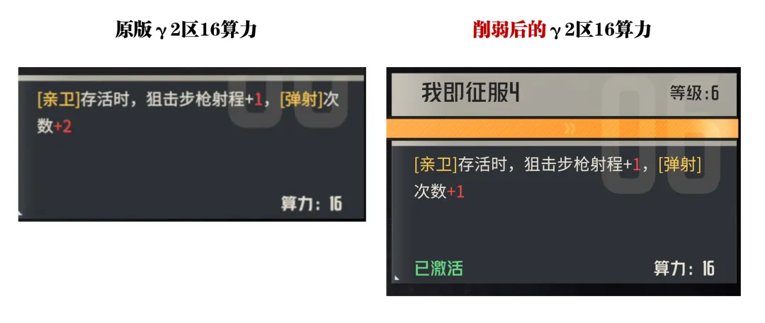 接着第三个削弱点则是针对γ2区16算力的削弱,这里将弹射的次数进行了削弱,从原本的2次削弱到了眼下的1次,这里主要会有两个影响,其一是削弱弹射次数会对奥德莉的单次总伤害造成一定的下滑,例如我们以原本弹射7次全部打到敌人为例,削减1次就是弹射6次,这样就会直接少10%的伤害,而如果我们把刚刚的弹射伤害从35%降低到30%的削弱项也一并算上,这里一共就会减少20%左右的伤害,当然还有个特殊状态下暴击伤害的降低大家也需要考虑。然后第二个影响则是针对我们在打单体boss时的影响,此时一般我们会以boss和亲卫作为两个弹弹对象,例如攻击1次+弹射1次,此时就是boss受到1次伤害+亲卫弹射1次,而当攻击1次+弹射2次时,此时boss就会受到1次伤害+1次弹射伤害,亲卫此时也是弹射一次,所以照此类推,当这个弹射次数达到一定标准是,降低1次弹射次数可能就会使单体boss少受到1次伤害,这个也是其较大的一个削弱影响。