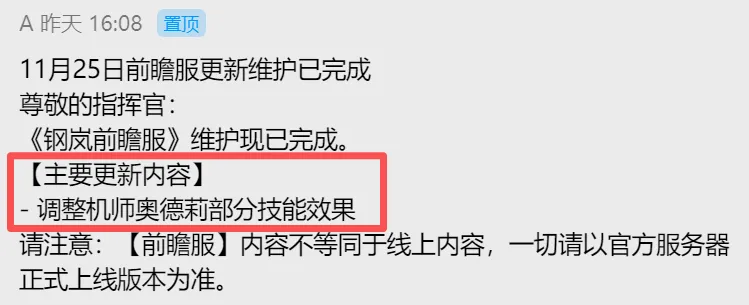 首先官方在有关前瞻服的调整公告中写的相当的晦涩,只提到了一句“调整机师奥德莉部分技能效果”,而这种表达也是一改之前的传统,例如之前对于部分机师或机兵的调整还会写到加强等字眼,但此次就只提“调整”二字那就相当有意思了,到底是加强还是削弱一概不提,更多让大家自行去找......这种逻辑相信大部分朋友也都能从一开始便感觉到不妙了。